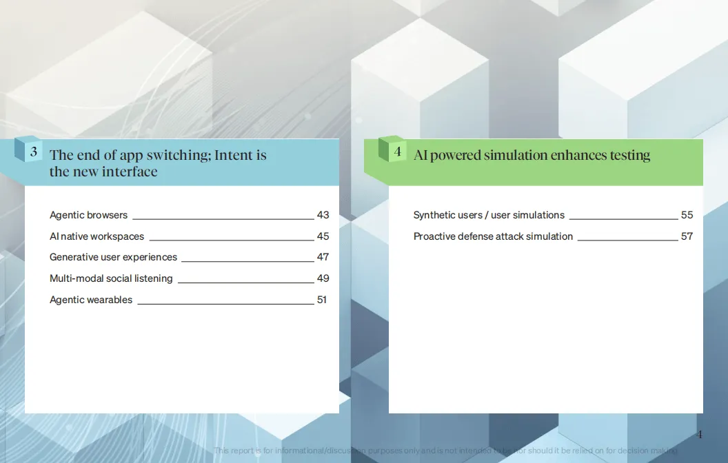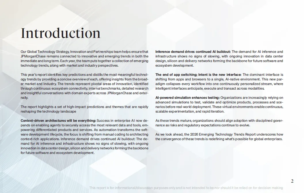 摩根大通2026年新兴技术趋势报告聚焦四大核心技术趋势,揭示了AI驱动下企业技术架构、基础设施、交互方式与测试体系的深度变革,这些趋势的融合正重新定义全球企业的技术发展边界,推动各领域从工具化应用向智能化、自主化生态演进。