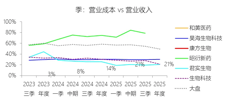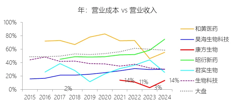 营业成本:2025年,康方生物的营业成本为6.52亿元,同比增长125.68%,与营业收入的比例为21.34%(营业成本率,即1-毛利率),同比上升7.73个百分点;2015-2024年(十年),此项合计为5.48亿元,平均比例为7.01%,比生物科技行业的均值低28.34个百分点,长期呈上升趋势。