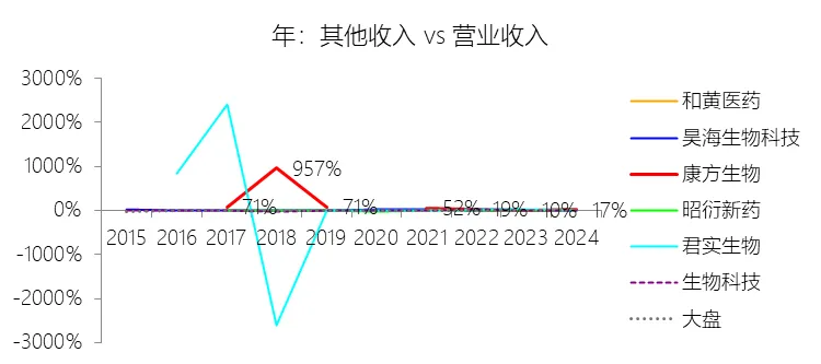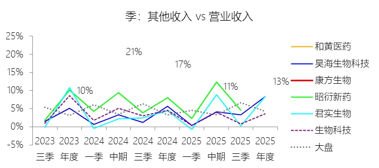 其他收入:2025年,康方生物的其他收入为3.83亿元,同比增长4.75%,与营业收入的比例为12.54%,同比下降4.69个百分点;2015-2024年(十年),此项合计为13.24亿元,平均比例为16.92%,比生物科技行业的均值高12.42个百分点,长期呈下降趋势。