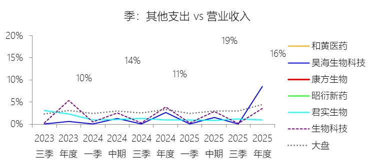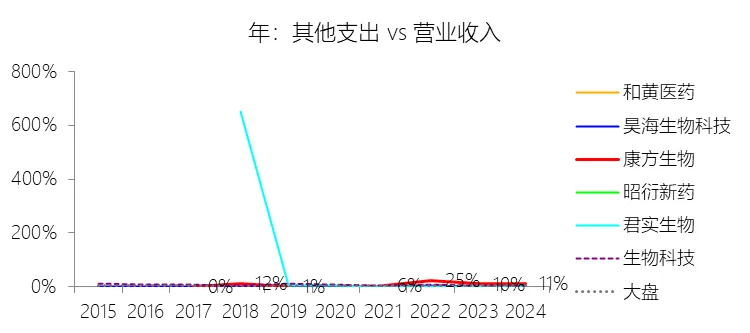 其他支出:2025年,康方生物的其他支出为4.89亿元,同比增长103.44%,与营业收入的比例为16.02%,同比上升4.69个百分点;2015-2024年(十年),此项合计为9.36亿元,平均比例为11.96%,比生物科技行业的均值高6.14个百分点,长期呈上升趋势。