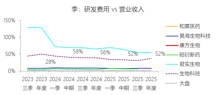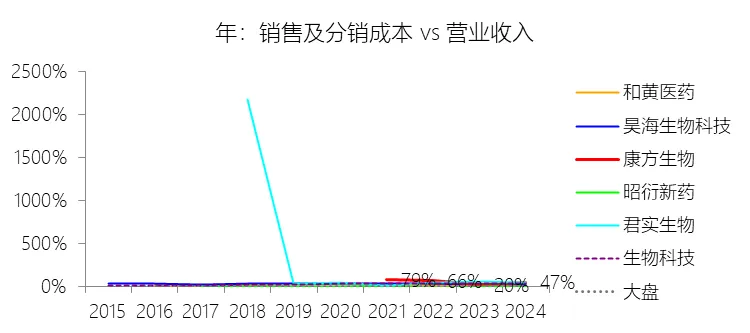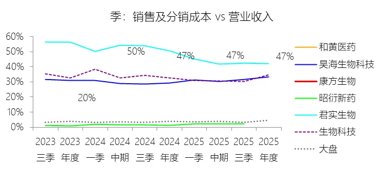 销售费用:2025年,康方生物的销售及分销成本为14.36亿元,同比增长43.37%,与营业收入的比例为46.99%(销售费用率),同比下降0.17个百分点;2015-2024年(十年),此项合计为26.24亿元,平均比例为33.52%,比生物科技行业的均值高1.66个百分点,长期呈下降趋势。