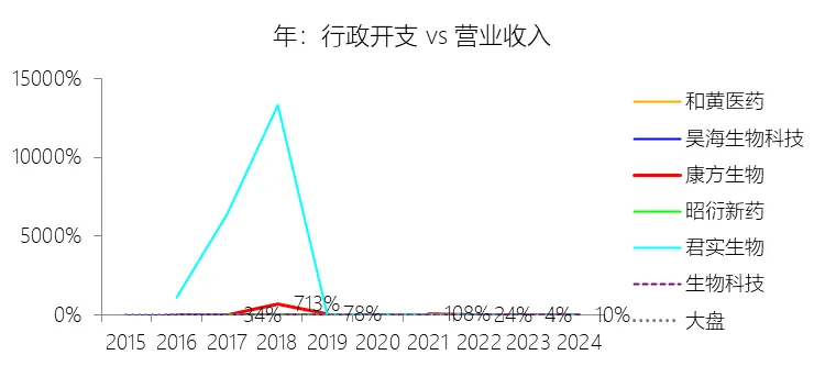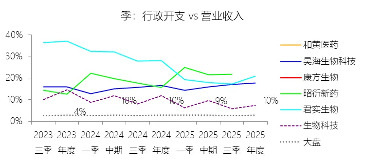 管理费用:2025年,康方生物的行政开支为2.96亿元,同比增长45.51%,与营业收入的比例为9.70%(管理费用率),同比上升0.11个百分点;2015-2024年(十年),此项合计为11.88亿元,平均比例为15.18%,比生物科技行业的均值低1.21个百分点,长期呈下降趋势。