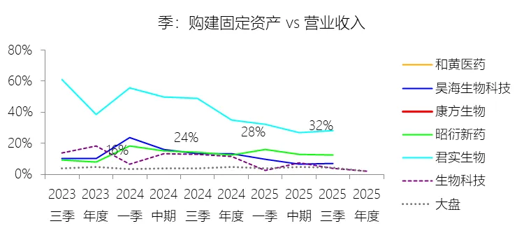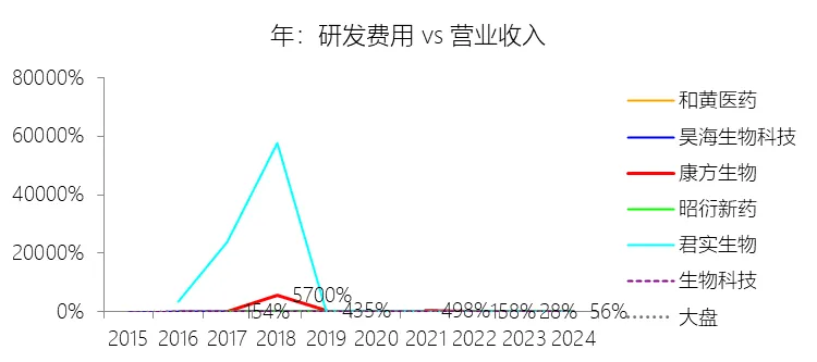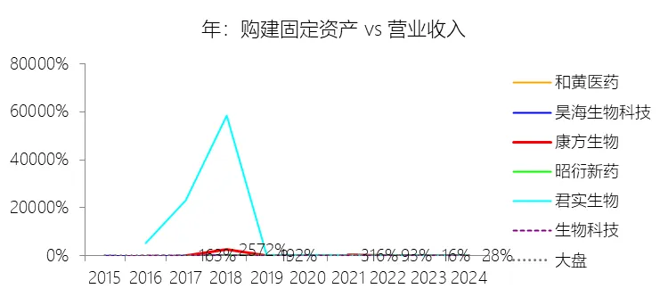 购建固定资产:2025年,康方生物的购建固定资产缺数据,与营业收入的比例无效;2015-2024年(十年),此项合计为35.11元,平均比例为44.86%,比生物科技行业的均值高25.12个百分点,长期呈下降趋势。