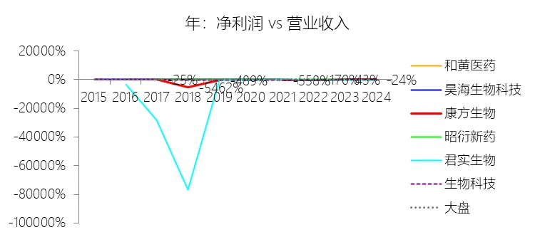 营业收入增长率:2025年,康方生物的营业收入为30.56亿元,同比增长43.9%,增速同比上升96.97个百分点;2015-2024年(九年)增长5193.71%,年复合增长76.3%,比生物科技行业的复合增速高42.62个百分点,长期呈下降趋势。增速短期上升主要由于2025年康方生物正式迈入“医保元年”,其两款全球首创双抗产品开坦尼®(卡度尼利)和依达方®(依沃西)首次纳入国家医保目录,凭借优异的临床价值在医保准入后实现快速上量,同时开坦尼®一线治疗胃癌等大适应症的获批进一步释放了市场潜力,加之非肿瘤领域的自免及代谢新药爱达罗®和伊喜宁®顺利启动商业化并贡献销售额,共同驱动商业销售收入同比大幅增长51.48%。增速长期下降主要由于公司在2015至2020年间多处于研发投入阶段,营业收入基数极低,初期任何授权收入的变动都会导致极高的百分比增速;而随着2023年确认了SUMMIT支付的依沃西授权首付款约29.23亿元,极大地拉高了对比基数,导致2024年在授权收入大幅减少的情况下增速出现负增长,且随着公司规模扩大,收入重心从波动性强的技术授权费转向稳健增长的商业销售,增速自然呈现向行业常态回归的下降趋势。增速高于生物科技行业的复合增速主要由于公司建立了具有国际竞争力的ACE和Tetrabody技术平台,专注于开发国际首创及同类最佳的新药,不仅通过开坦尼®和依沃西等核心双抗产品引领了肿瘤免疫治疗2.0时代,还通过与默克、SUMMIT等跨国药企达成重大的全球授权交易,实现了研发成果的高效商业转化,这种从源头创新到快速商业化的一体化高效循环体系,使其在产品力和资金回笼效率上均显著领先于行业平均水平。