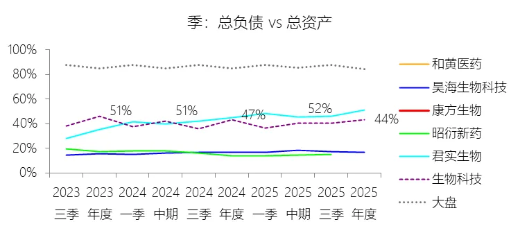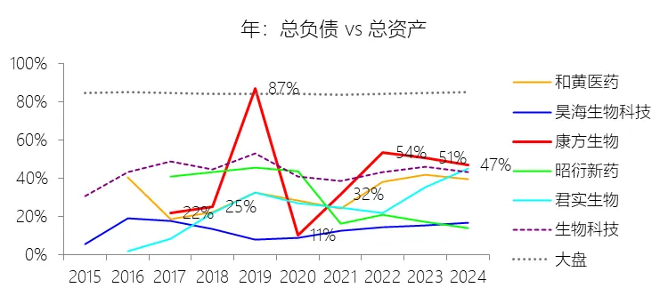 负债率:2025年末,康方生物的总负债为70.54亿元,对比年初增长17.55%,与总资产的比例为44.09%(负债率),同比下降2.96个百分点;2015-2024年(十年),此项与总资产的平均比例为44.36%,比生物科技行业的均值高0.94个百分点,长期呈上升趋势。**比例短期下降主要由于**2025年公司资产总额的增长(25.44%)显著快于负债总额的增长(17.55%),随着开坦尼®和依达方®等核心产品纳入医保后实现商业销售收入51.48%的强劲增长,公司现金及银行结余增至88.22亿元,有效夯实了资产底座,使得负债率在业务规模扩张的同时录得小幅回落。**比例长期上升主要由于**公司在2015至2024年间经历了从纯研发向全产业链生物制药公司的跨越,为支持ACE技术平台下50多个在研项目的管线开发及大规模临床试验,公司持续加大融资力度,十年间研发开支合计达61.88亿元,且为保障产品上市后的自主供应,公司通过银行借款及其他融资方式在广州、中山等地大规模投建生产设施,导致负债总额随业务版图的快速扩张而呈趋势性上升。**比例高于生物科技行业的均值主要由于**公司采取了垂直一体化的“研产销”闭环发展战略,相比行业内多数轻资产运作的研发型企业,康方生物在物业、厂房及设备等非流动资产上投入巨大,如总规划产能超10万升的翠亨康方湾区科技园等世界级生产设施的建设需依赖大规模的长期银行贷款支持;同时,公司通过ACE平台保持着极高的研发强度,历史上研发费用占营业收入的平均比例高达79.05%,这种高投入、重资产的创新模式使得其在发展阶段的杠杆水平略高于行业平均水平。