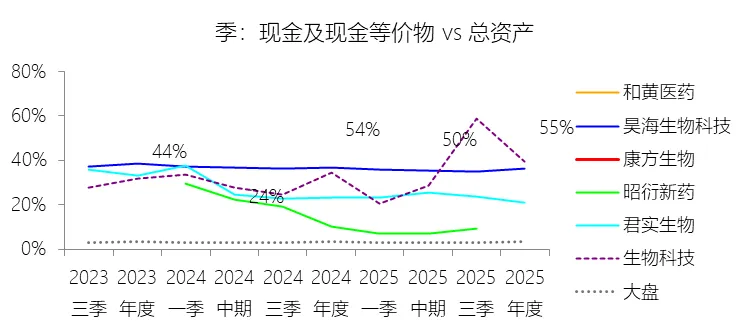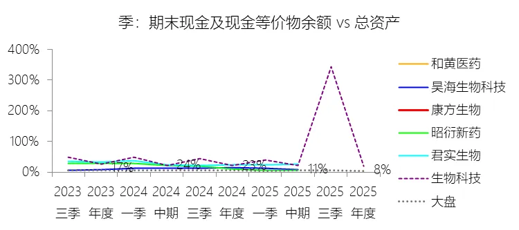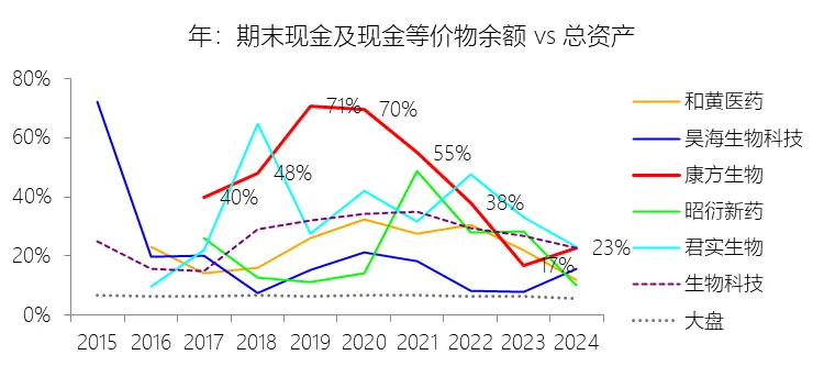 期末现金及现金等价物余额:2025年末,康方生物的期末现金及现金等价物余额为12.80亿元,对比年初减少56.11%,与总资产的比例为8.00%,同比下降14.86个百分点;2015-2024年(十年),此项与总资产的平均比例为34.89%,比生物科技行业的均值高6.31个百分点,长期呈下降趋势。