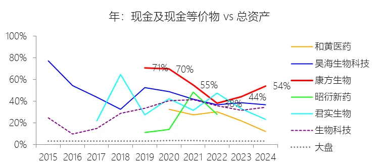 现金及现金等价物:2025年末,康方生物的现金及现金等价物为88.22亿元,对比年初增长27.53%,与总资产的比例为55.14%,同比上升0.9个百分点;2015-2024年(十年),此项与总资产的平均比例为50.22%,比生物科技行业的均值高15.93个百分点,长期呈下降趋势。