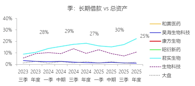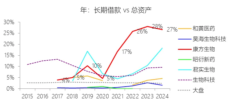长期借款:2025年末,康方生物的长期借款为39.55亿元,对比年初增长16.11%,与总资产的比例为24.72%,同比下降1.99个百分点;2015-2024年(十年),此项与总资产的平均比例为22.11%,比生物科技行业的均值高14.1个百分点,长期呈上升趋势。