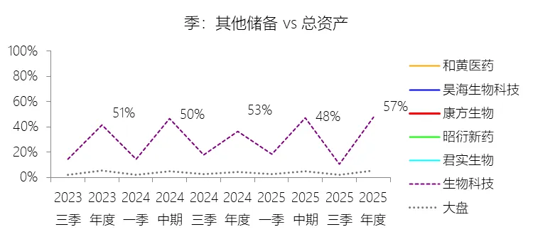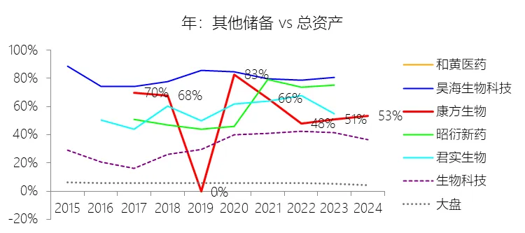 其他储备:2025年末,康方生物的其他储备为90.48亿元,对比年初增长32.79%,与总资产的比例为56.55%,同比上升3.13个百分点;2015-2024年(十年),此项与总资产的平均比例为54.68%,比生物科技行业的均值高17.43个百分点,长期呈下降趋势。