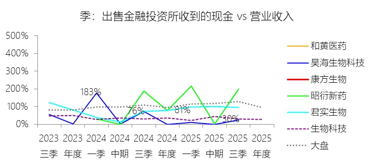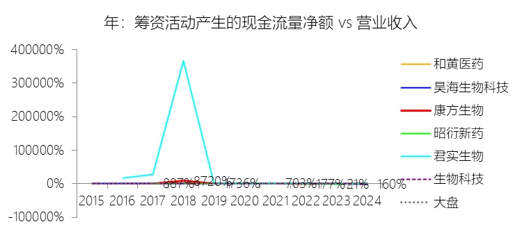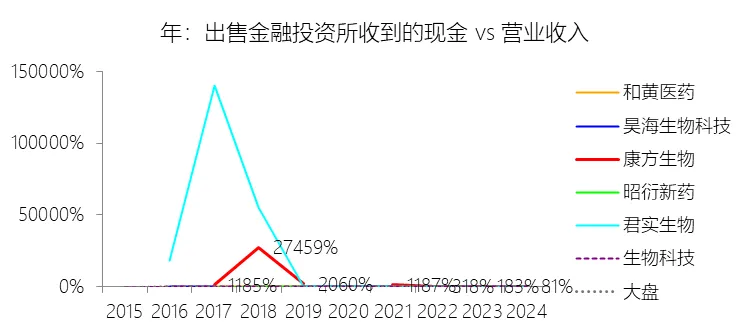 出售金融投资所收到的现金:2025年,康方生物的出售金融投资所收到的现金缺数据,与营业收入的比例无效;2015-2024年(十年),此项合计为198.28元,平均比例为253.32%,比生物科技行业的均值高192.96个百分点,长期呈下降趋势。