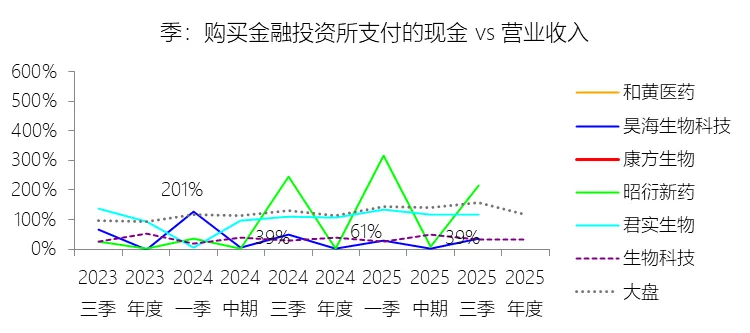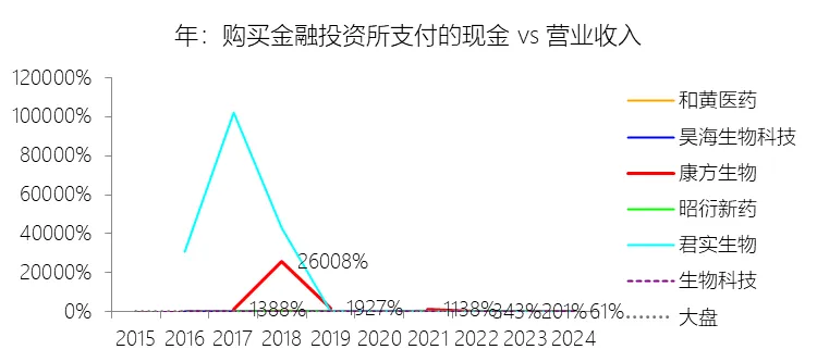 购买金融投资所支付的现金:2025年,康方生物的购买金融投资所支付的现金缺数据,与营业收入的比例无效;2015-2024年(十年),此项合计为203.62元,平均比例为260.14%,比生物科技行业的均值高189.97个百分点,长期呈下降趋势。