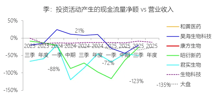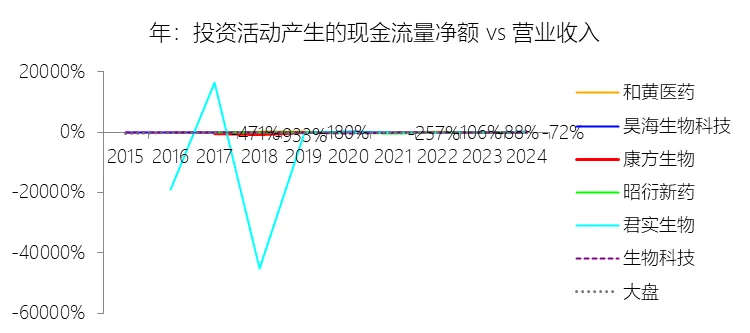 投资活动产生的现金流量净额:2025年,康方生物的投资活动产生的现金流量净额为-41.13亿元,绝对值同比增长170.09%,与营业收入的比例为-134.58%,同比下降62.88个百分点;2015-2024年(十年),此项合计为-78.88亿元,平均比例为-100.78%,比生物科技行业的均值低63.49个百分点,长期呈上升趋势。