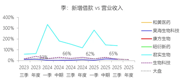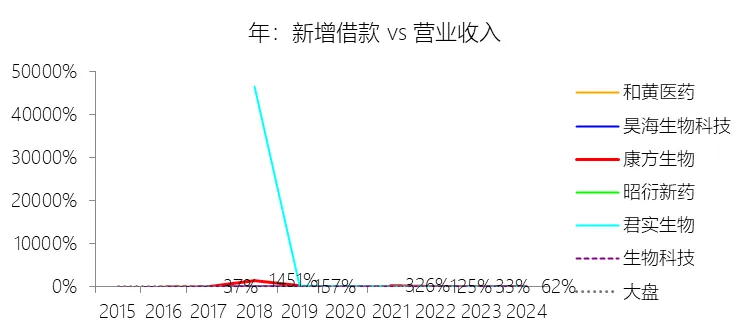 新增借款:2025年,康方生物的新增借款缺数据,与营业收入的比例无效;2015-2024年(十年),此项合计为49.27元,平均比例为62.94%,比生物科技行业的均值高28.41个百分点,长期呈下降趋势。