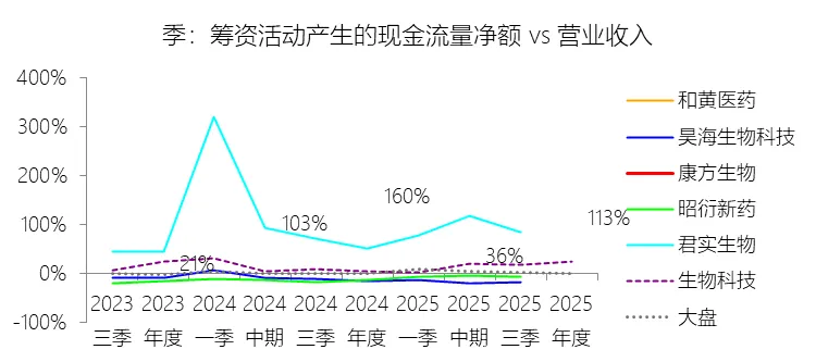 筹资活动产生的现金流量净额:2025年,康方生物的筹资活动产生的现金流量净额为34.58亿元,同比增长2.03%,与营业收入的比例为113.15%,同比下降46.42个百分点;2015-2024年(十年),此项合计为121.33亿元,平均比例为155.02%,比生物科技行业的均值高80.6个百分点,长期呈下降趋势。
