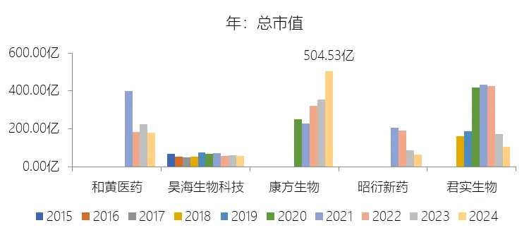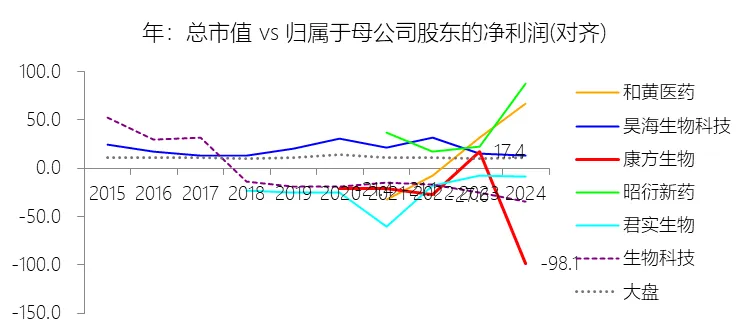 市值增长率:2025年末,康方生物的总市值为940.15亿元,对比年初增长86.34%,增速同比(去年同期)上升43.68个百分点;2015-2024年(九年)增长100.43%,年复合增长18.99%,比生物科技行业的复合增速低13.04个百分点,长期呈上升趋势。**增速短期上升主要由于**2025年公司正式迈入“医保元年”,核心产品开坦尼®和依达方®成功纳入国家医保目录后,凭借优异的临床价值在全国范围内实现速赢准入与快速上量,驱动商业销售收入同比强劲增长51.48%;同时,依沃西在海外的临床获益获全球认可并获FDA受理上市申请,加之非肿瘤领域的伊喜宁®和爱达罗®顺利开启商业化进程,极大地提振了投资者对公司盈利前景的信心,推动股价与市值在2025年大幅反弹。**增速长期上升主要由于**公司在2015至2024年间完成了从纯研发向全产业链商业化Biopharma的跨越,依托ACE和Tetrabody技术平台建立起包含开坦尼®和依沃西在内的50多个在研项目管线,自主创新能力得到持续验证;特别是2023年通过与SUMMIT达成创纪录的海外授权交易,不仅确立了FIC/BIC产品的全球领导地位,还实现了公司首次年度盈利并积累了丰厚的现金储备,使得市值增长逻辑由早期的“估值预期”逐步转向“业绩兑现”。**增速低于生物科技行业的复合增速主要由于**生物科技行业样本涵盖了大量处于不同生命周期的企业,行业均值极易受到新上市公司初期高估值脉冲及微盘股高波动增长的拉动;而康方生物在2020年上市时已具备约250亿元的较高估值基数,且随后几年间港股生物医药板块经历了整体估值中枢下行的系统性回调,导致其在行业价值回归过程中的名义复合增速相对平缓;此外,资本市场对公司价值的认知经历了从关注研发进度到关注医保准入及规模化盈利的深度切换,其市值增长在2023年重磅首付款确认前受制于生物科技板块整体的投融资寒冬,呈现出稳健增长而非盲目扩张的特征。