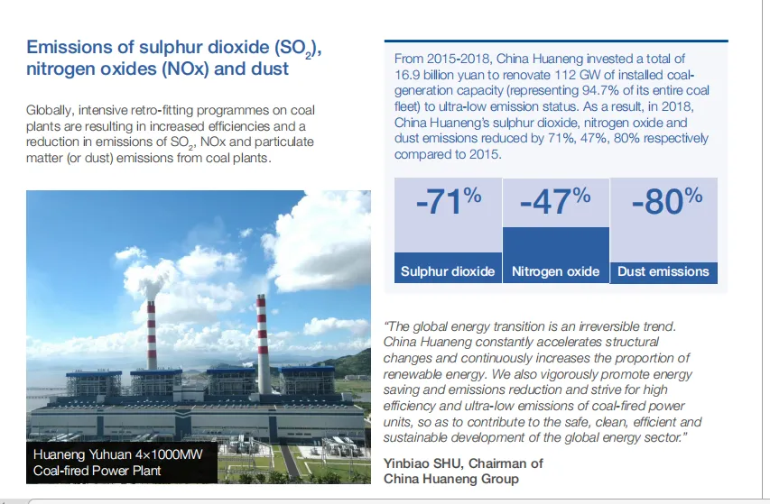 从2015年至2018年,中国华能累计投资169亿元人民币,将1.12亿千瓦的燃煤机组容量(占其全部燃煤机组的94.7%)改造为超低排放状态。2018年,中国华能的二氧化硫、氮氧化物和粉尘排放,比2015年分别下降了71%,47%和80%。