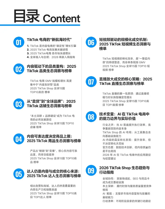 围绕品牌本土化适配、内容放量结构、达人协同模型等核心议题,白皮书全面复盘了2025年从“流量红利”迈向“结构竞争”的关键路径。这不仅是一份跨市场的差异化发展指南,更是一部凝聚全球一线实战经验与2026增长路径预测的实操手册,助你看透数据背后的底层逻辑,精准抢占2026确定性先机。
