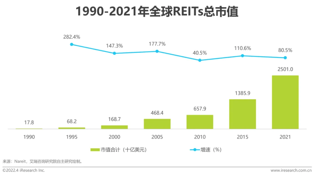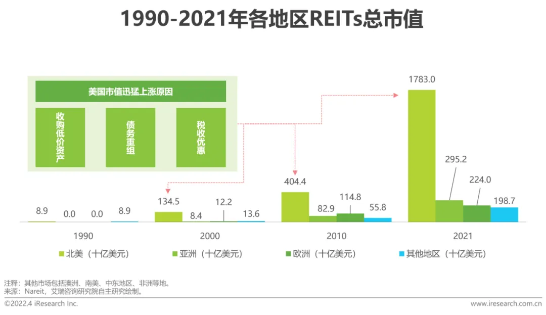 1990-2021年REITs市值年均增长率超过18%,但北美市场市值远超其他地区