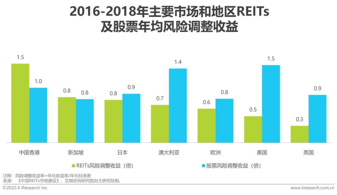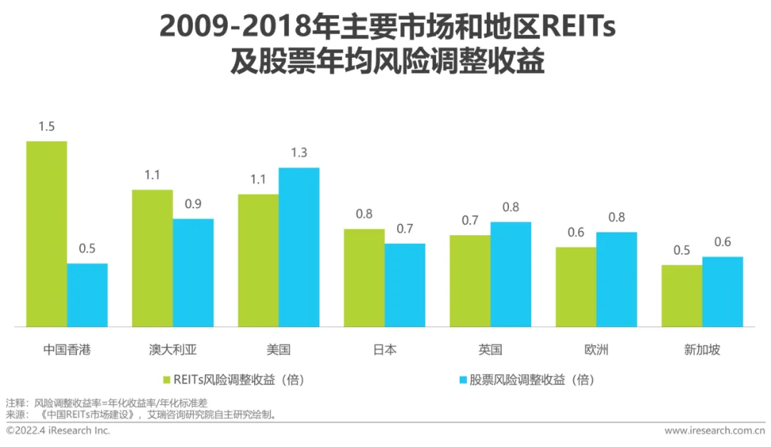 中短期(3年)各市场REITs风险调整收益区间介于0.31-1.48,股票风险调整收益区间介于0.81-1.45;而长期(10年)各市场REITs风险调整收益区间介于0.5-1.5,股票风险调整收益区间介于0.51-1.29。这说明股票在中短期表现高于REITs,而在长期投资中REITs平均表现要高于股票。