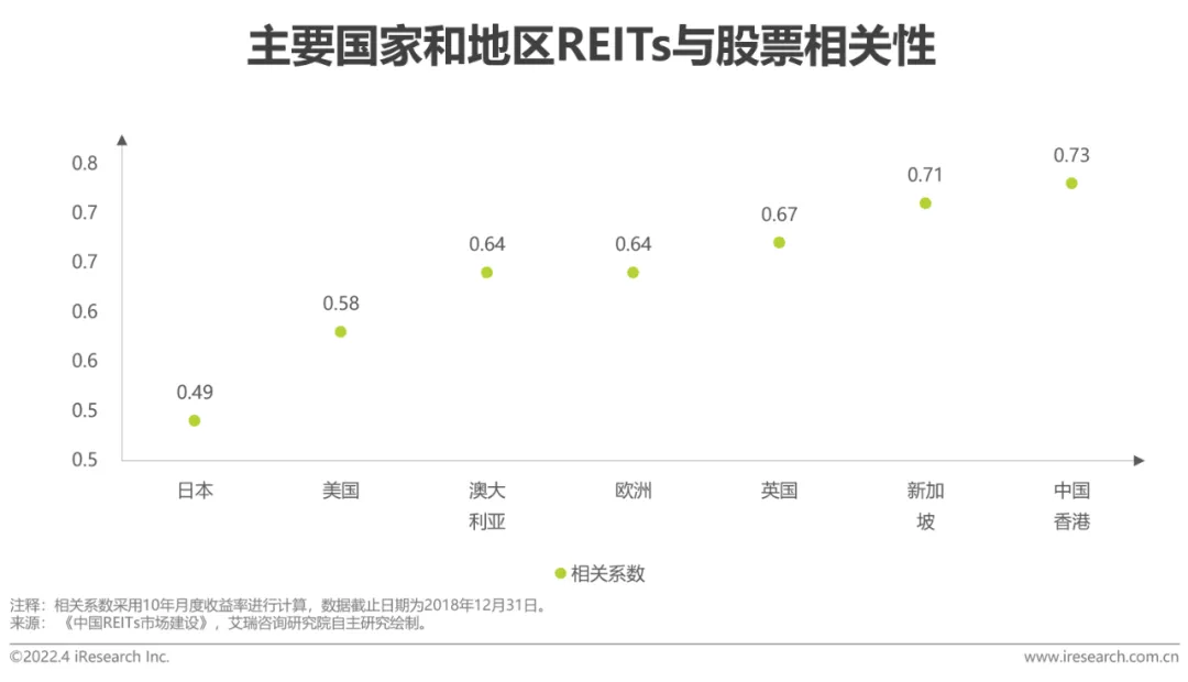 整体而言,REITs市场之间以及与股票市场的相关性普遍较低,能够实现风险分散化。日本、美国、澳大利亚、欧洲以及英国市场相关系数低于0.7,而新加坡及中国香港市场相关系数介于0.7-0.75之间。