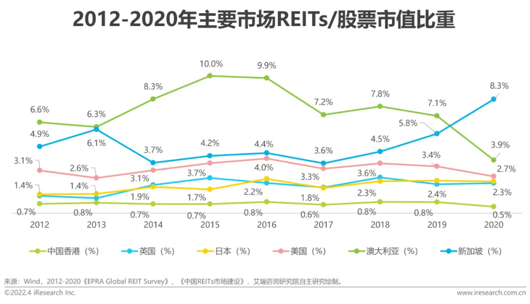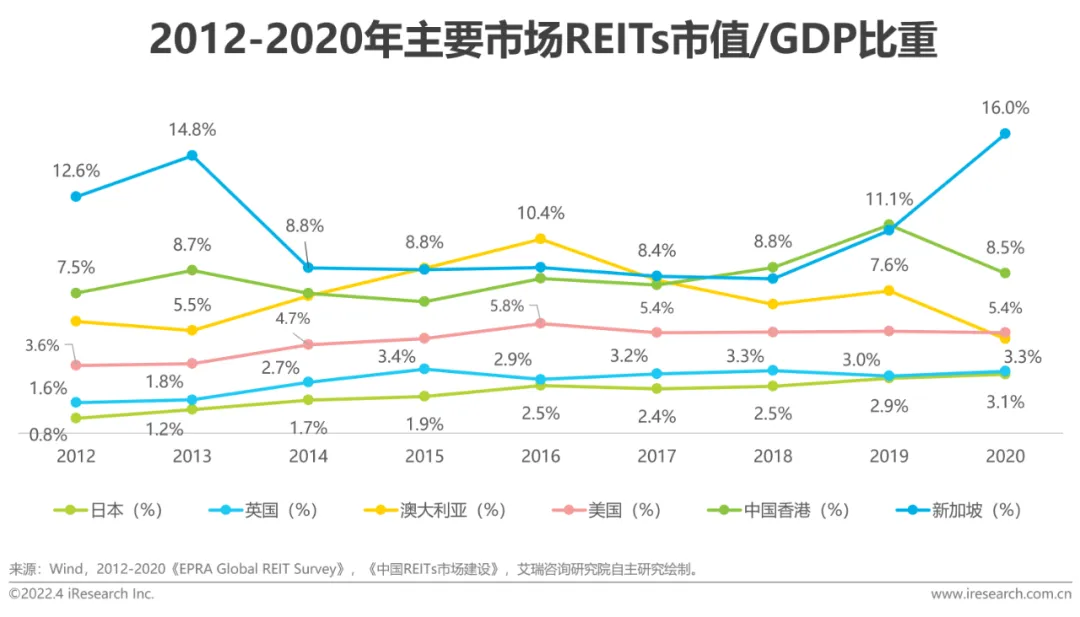 ,2012-2020年,该比重在全球主要市场逐渐提升。2020年,该指标介于3.1%-16.0%之间。2020年,中国GDP水平约为101万亿元,根据该指标的简单推算中国境内REITs市场规模约为3.1-16.3万亿元之间,均值为9.7万亿元。