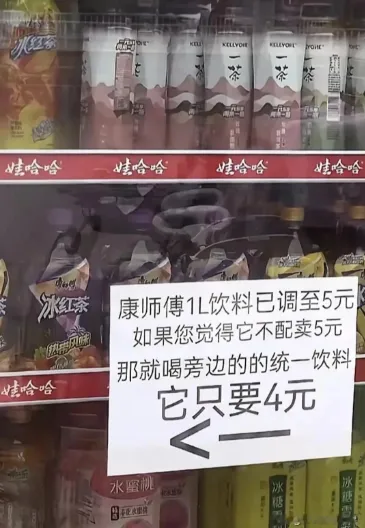 2023年底至2024年中,康师傅两轮涨价:先上调饮品价,后跟进方便面涨价,1L装冰红茶从4元涨至5元,涨幅25%。湖北黄冈一家便利店显示,其涨价后三个月仅售6瓶,而统一冰红茶日销达20瓶,消费者用选择给出了答案。
