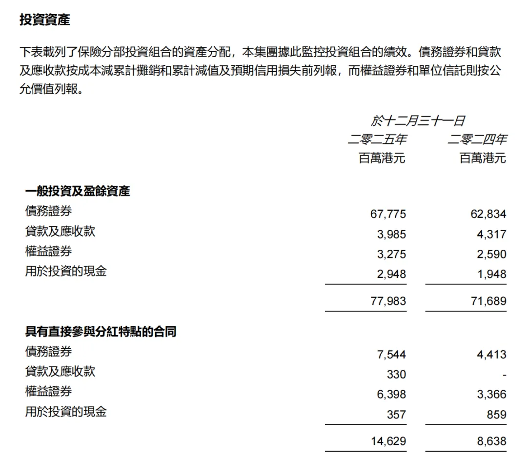 而在1071亿元的总资产中,投资及现金和存款总额为904.13亿港元,其中包括 78%债券,5%贷款及应收款,11%为权益证券以及6%现金和存款。在固定收入投资组合中,97% 的固定收入投资为投资级别 (即 BBB-或以上) ,其中包括 6%为 AAA 级,20%为 AA 级,45%为 A 级,26%为 BBB 级,其余3%则为BB级或以下。