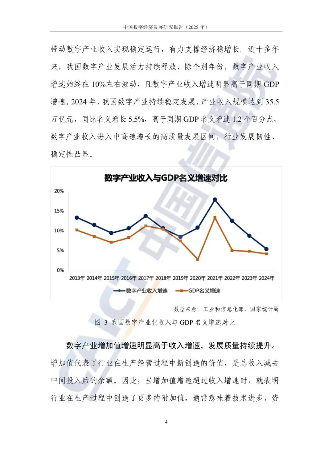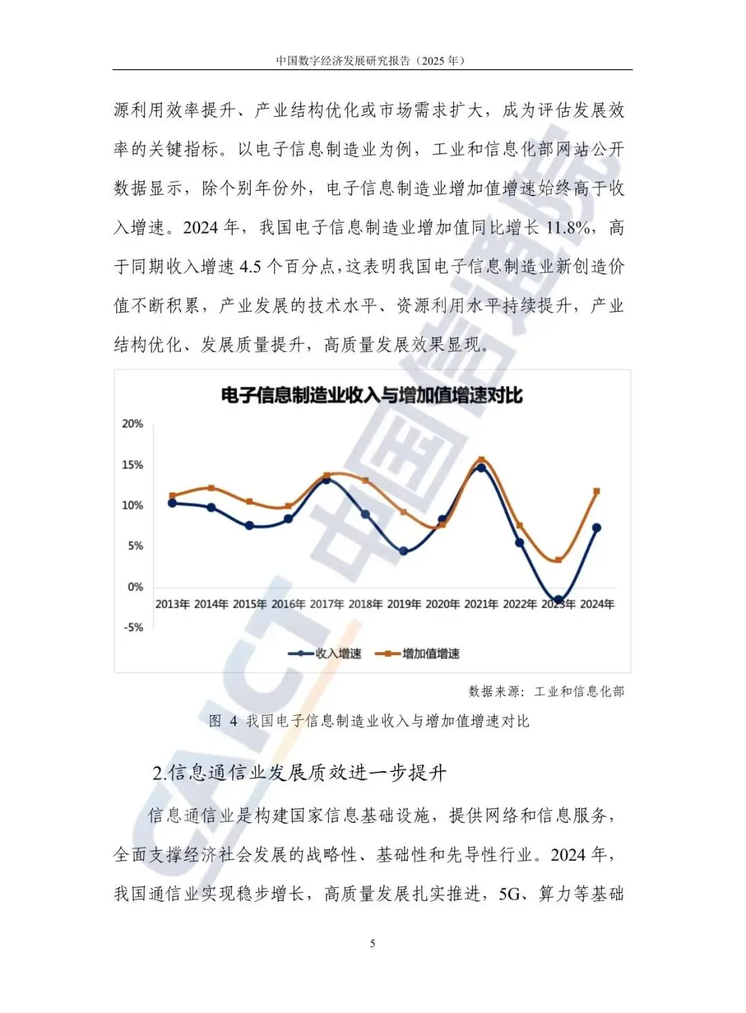数字产业作为数字经济的基础,其高质量发展能力持续增强。2024年,我国数字产业收入规模达35.5万亿元,同比增长5.5%,高于同期GDP增速。特别值得注意的是,以电子信息制造业为例,其增加值增速(11.8%)显著高于收入增速,表明产业创造新价值的能力不断提升,发展质量持续优化。信息通信业作为战略性基础行业,5G网络建设全球领先,5G-A进入规模发展新阶段,算力基础设施提质增效,为数字经济发展夯实了根基。