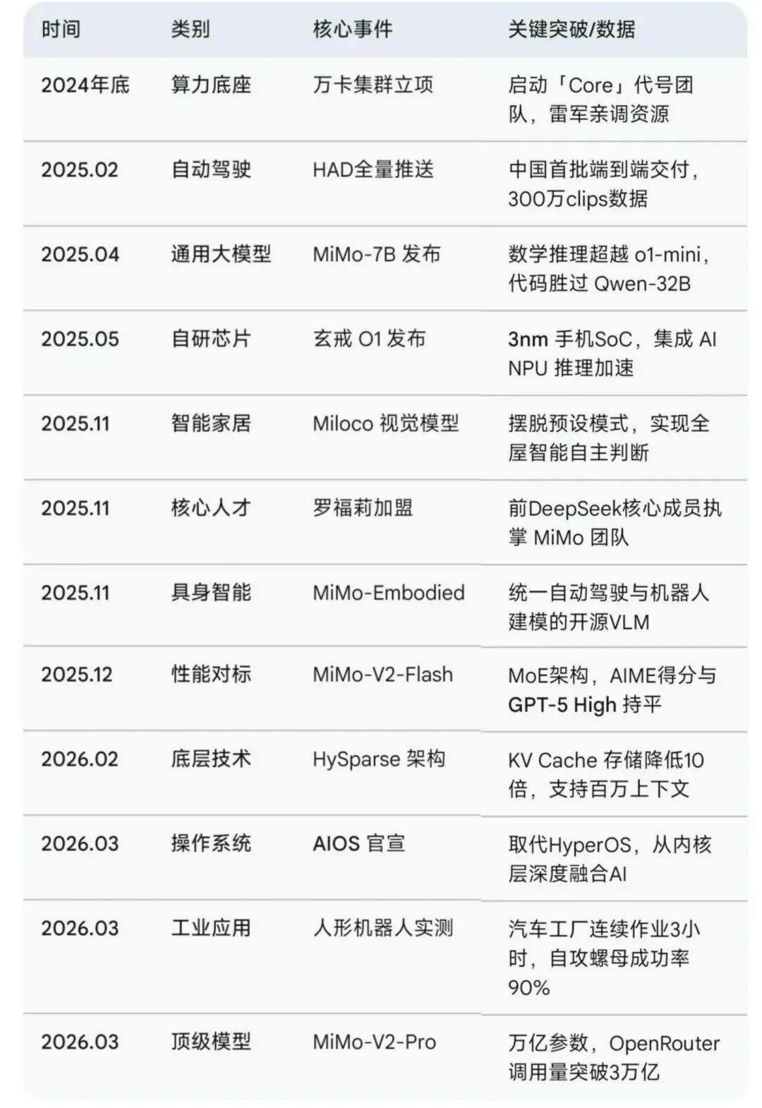 说到做产品,雷军去年明确表示,2026 年是小米技术的爆发年。目标是在一款核心终端产品上实现自研芯片(玄戒系列)、自研 OS(AIOS)以及自研大模型(MiMo)的深度融合,非常值得期待。