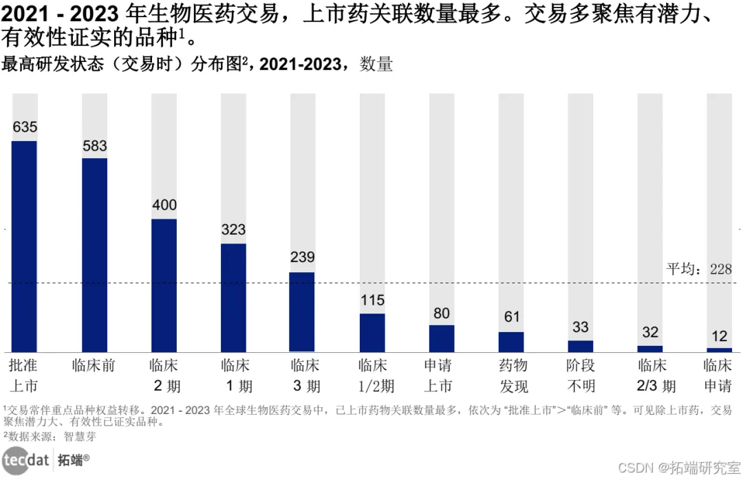 全球生物医药交易趋势2021 – 2023 年全球生物医药交易中,上市药物关联最多。交易聚焦上市及有潜力、有效性证实的品种。总体呈现出 “批准上市” 的药物在交易中数量最为突出,其次是 “临床前” 阶段的药物,接着依次为 “临床 2 期”“临床 1 期” 和 “临床 3 期”。这充分表明,除了那些已经被市场所证实的上市药物之外,交易更多地将目光聚焦在那些具有巨大潜力且有效性已经得到一定程度证实的品种上。