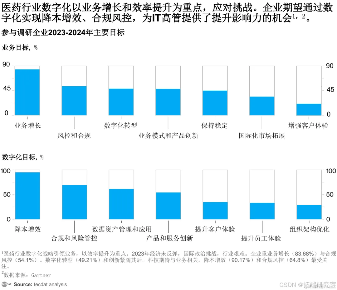 运营成本结构优化25%以上(图3建议插入此处:人机协同岗位能力模型)医药行业数字化聚焦在充满挑战的2023年,医药企业将业务增长(82.78%)和风控合规(54.3%)作为核心目标。降本增效(90.07%)和合规及风险管控(64.9%)是科技应用的主要方向,数据资产管理与应用、产品和服务创新等也是关注重点。