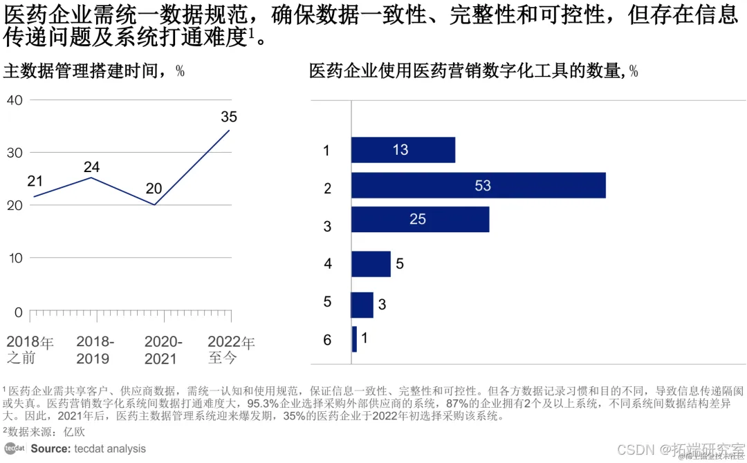 医疗企业面临合规限制、数据管理机制不完善和数据流通障碍三大挑战。87%的企业拥有两个及以上医药营销数字化系统,数据互通难题催生主数据管理系统需求,35%的企业在2022年部署该系统。