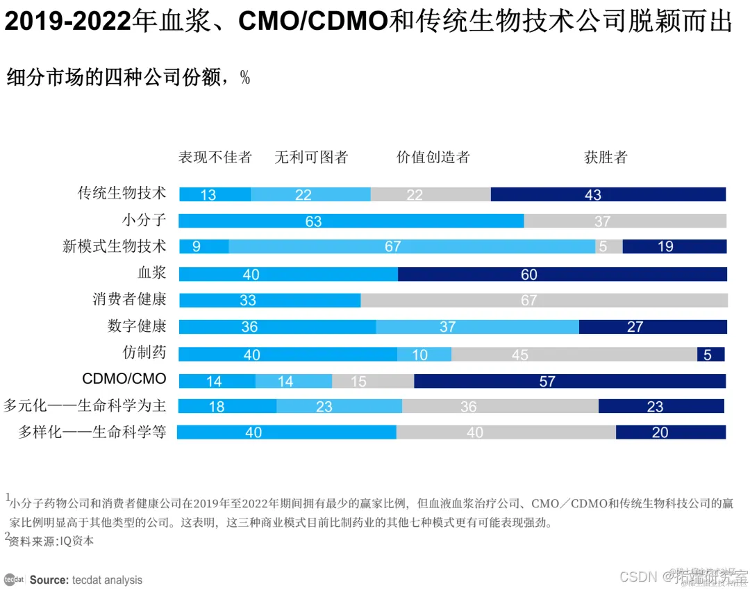 2019-2022年血浆、CMO/CDMO和传统生物技术公司表现出色,小分子药物公司面临价格压力和创新困境。传统生物科技公司通过针对性收购实施战略,但部分企业面临生物类似药竞争挑战。