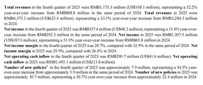 2025年营收43.73亿元,同比增33.1%、净利润13.08亿元,同比大增51%、新保单量突破3066万份的亮眼业绩。