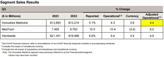 2023年10月21日/医麦客新闻 eMedClub News/--这周二强生发布第三季度财报,公布了最近一个季度(Q3)213.5亿美元的销售额,与去年同期相比增长了6.8%,显示出强劲的销售增长。与2022年同期相比,该公司第三季度调整后的营业销售额也增长了4.9%。强生第三季度的大部分收入来自其创新药物业务,专注于开发不同疾病领域的药物,带来了138.9亿美元的收入,与2022年同期相比,调整后的运营销售额增长了4.4%。