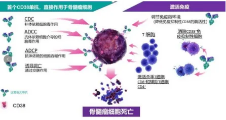 CD38是一种细胞表面的酶(胞外酶),也是一种受体,参与跨膜信号传导和细胞粘附功能,在正常情况下淋巴细胞、髓系细胞和其他非造血组织细胞表面呈低表达状态,但是高表达于恶性浆细胞(骨髓瘤细胞)。达雷妥尤单抗可以直接与骨髓瘤细胞表面CD38结合,通过多重机制诱导骨髓瘤细胞死亡,达到疾病的快速缓解。