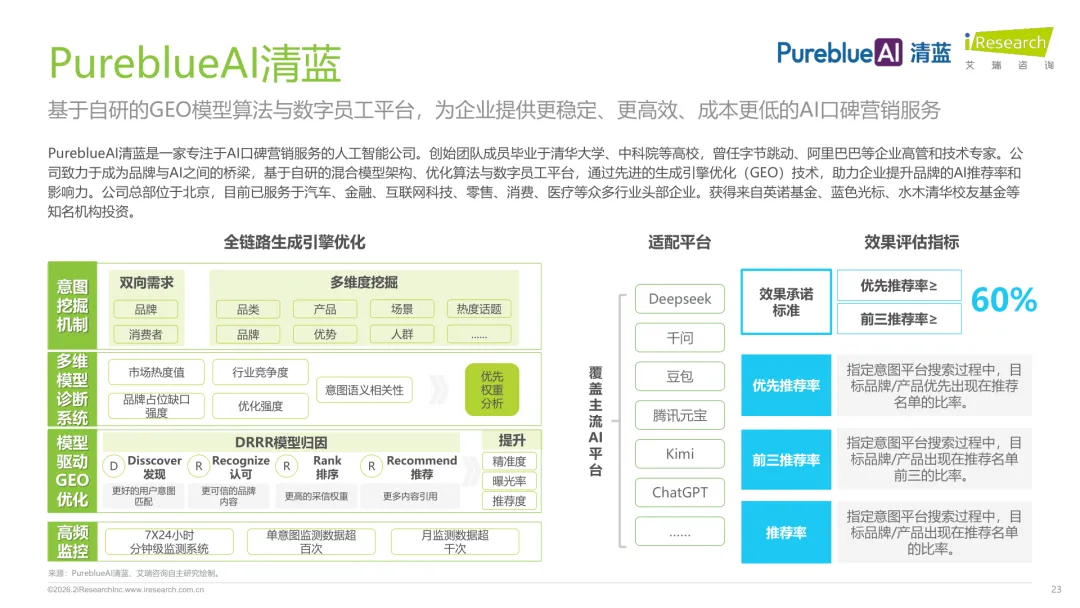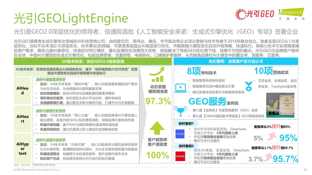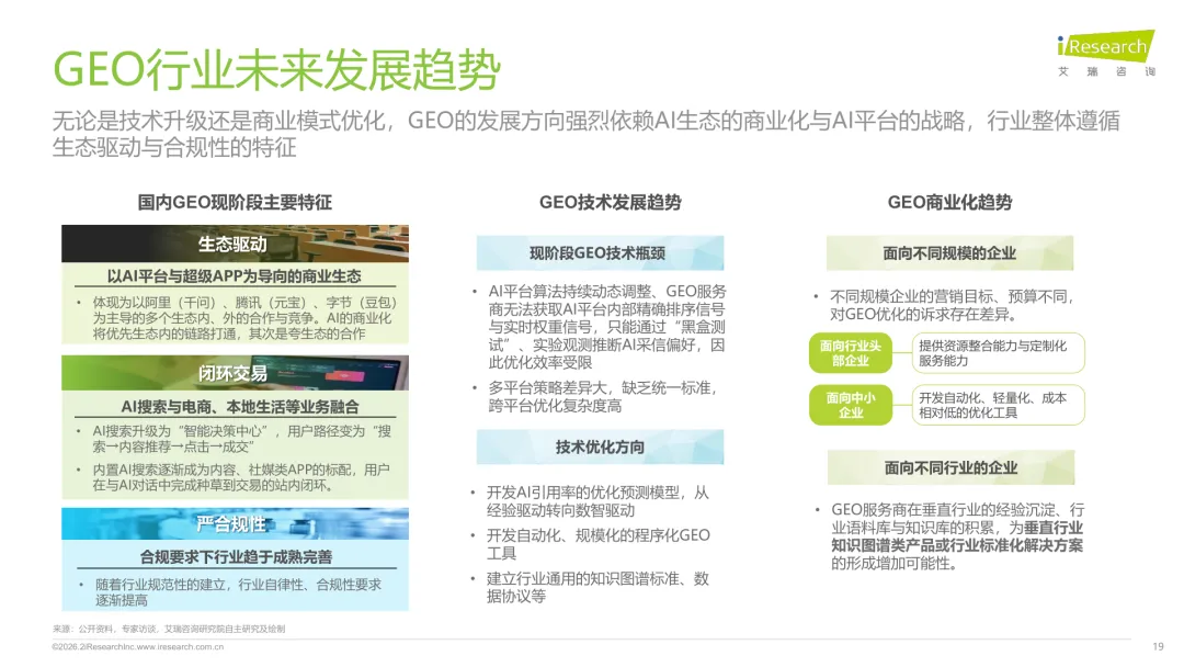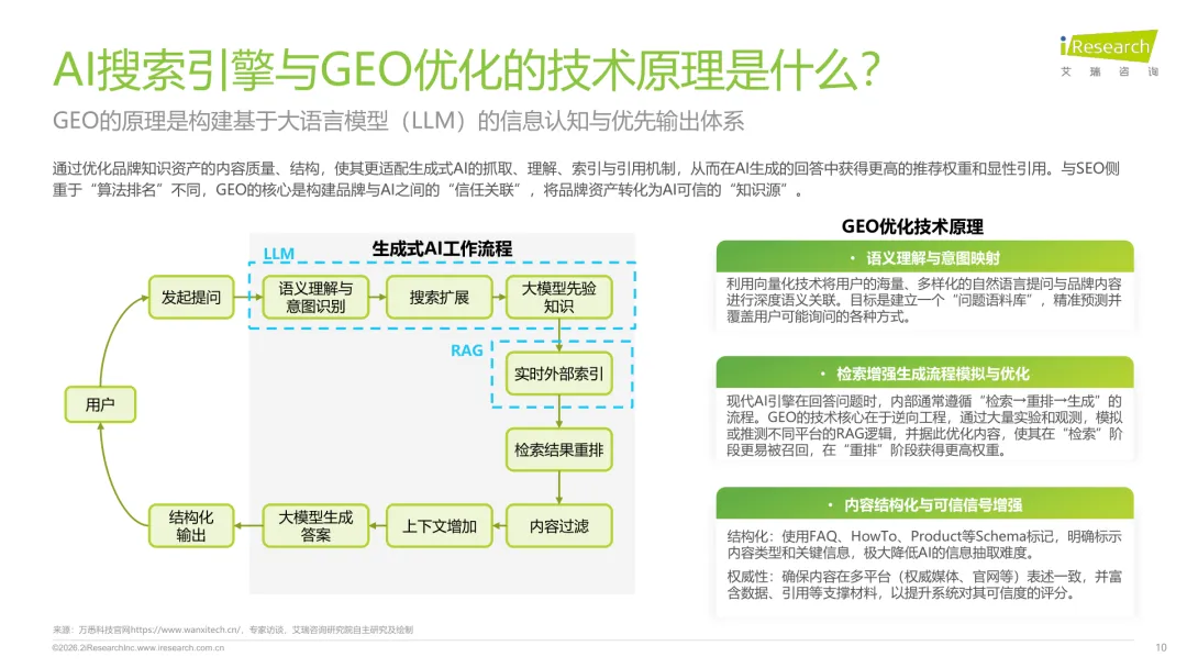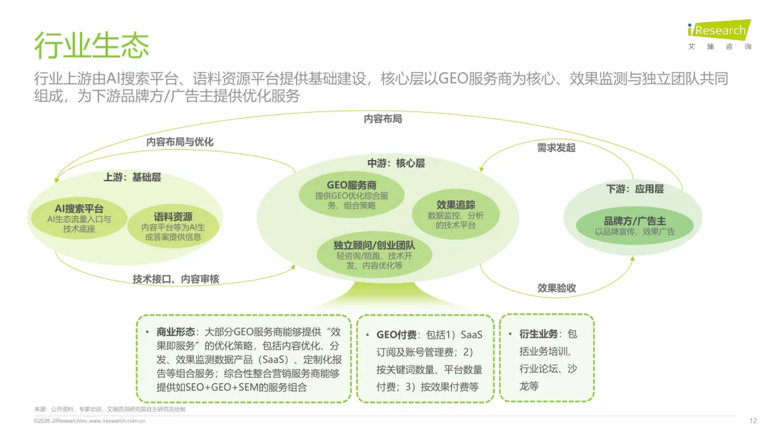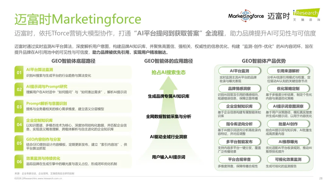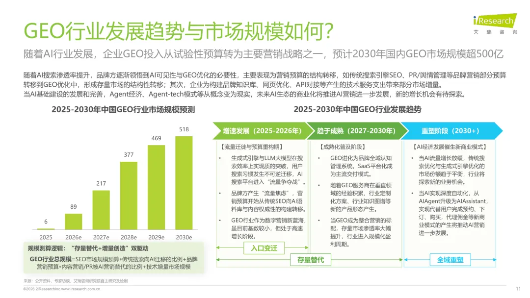 导读:生成式 AI 推动信息获取范式变革,用户搜索从 “链接导向” 转向 “答案导向”,GEO 作为新兴营销优化策略应运而生。其核心是通过优化内容适配大模型逻辑,构建品牌与 AI 的信任关联,提升品牌在 AI 答案中的可见性与引用权重。行业生态已初步成型,上游由 AI 搜索平台与语料资源平台提供基础支撑,中游 GEO 服务商通过全链路解决方案赋能下游品牌。优化策略聚焦语义匹配、内容结构化与权威信源构建,效果评估涵盖可见性、内容层、技术层及业务层指标。随着 AI 应用普及,品牌营销预算向 GEO 转移,预计 2030 年国内市场规模将超 500 亿元。行业发展面临多平台策略差异大、归因难等挑战,合规化成为重要趋势。智推时代、PureblueAI 清蓝等企业推出成熟解决方案,在金融、3C 等领域验证成效。未来 GEO 将向数智驱动、多模态优化演进,成为品牌全域营销的核心组成。