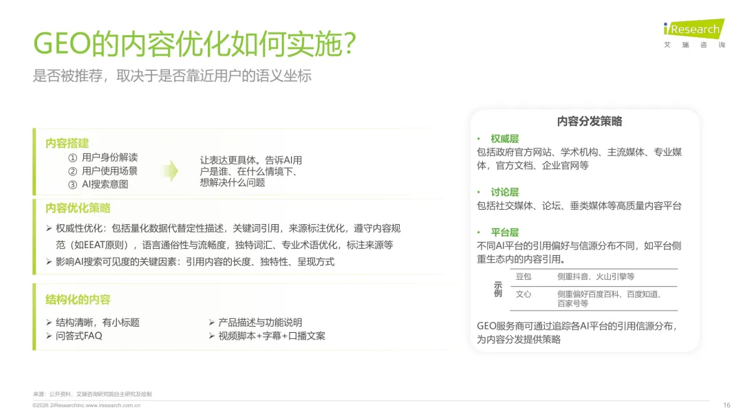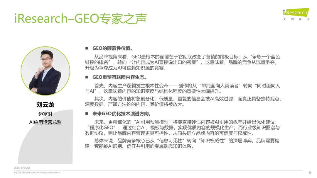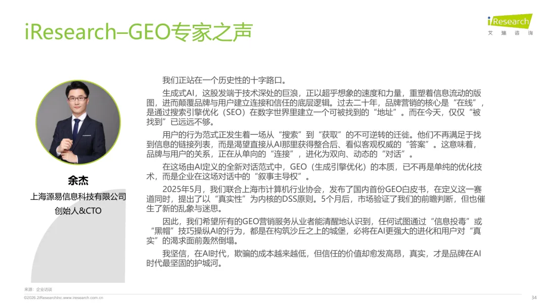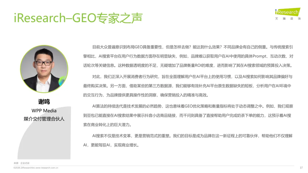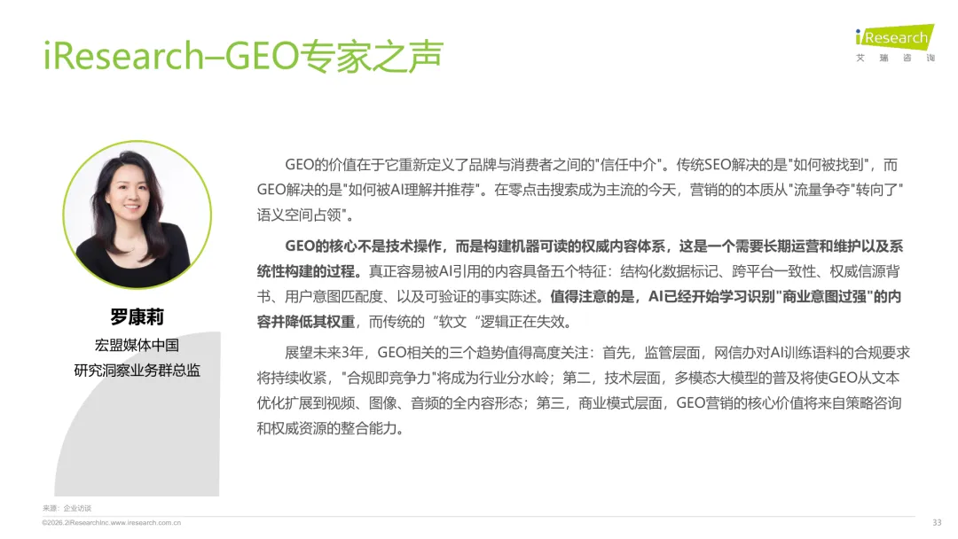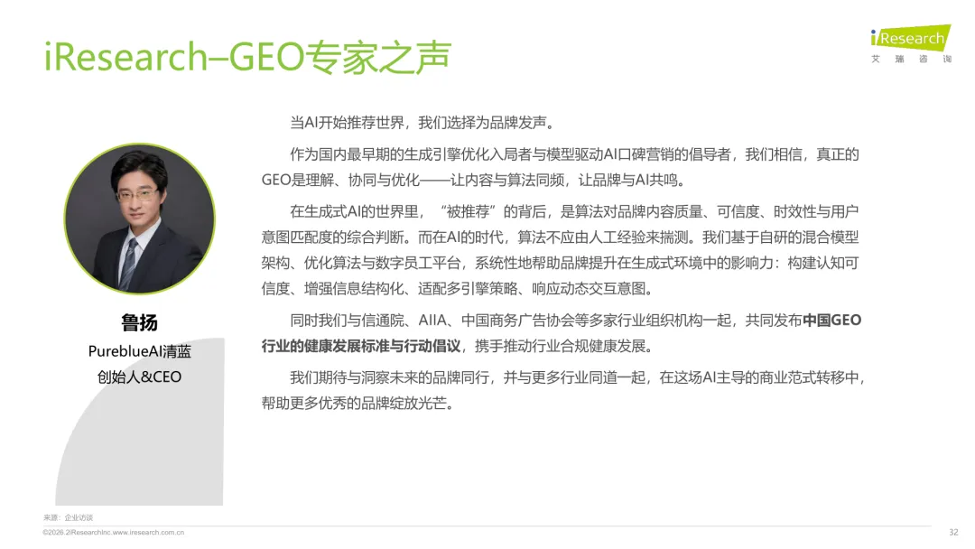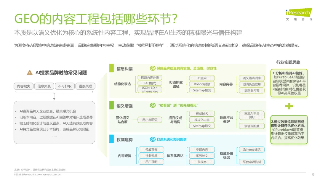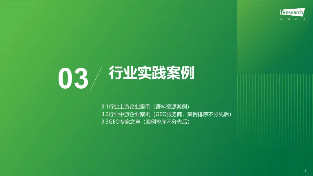 导读:生成式 AI 推动信息获取范式变革,用户搜索从 “链接导向” 转向 “答案导向”,GEO 作为新兴营销优化策略应运而生。其核心是通过优化内容适配大模型逻辑,构建品牌与 AI 的信任关联,提升品牌在 AI 答案中的可见性与引用权重。行业生态已初步成型,上游由 AI 搜索平台与语料资源平台提供基础支撑,中游 GEO 服务商通过全链路解决方案赋能下游品牌。优化策略聚焦语义匹配、内容结构化与权威信源构建,效果评估涵盖可见性、内容层、技术层及业务层指标。随着 AI 应用普及,品牌营销预算向 GEO 转移,预计 2030 年国内市场规模将超 500 亿元。行业发展面临多平台策略差异大、归因难等挑战,合规化成为重要趋势。智推时代、PureblueAI 清蓝等企业推出成熟解决方案,在金融、3C 等领域验证成效。未来 GEO 将向数智驱动、多模态优化演进,成为品牌全域营销的核心组成。