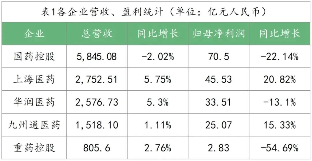 2025年4月,国药控股、上海医药、华润医药、九州通医药、重药控股分别发布了2024年财报,具体如表1所示。从数据来看,国药控股营收和利润均出现了不同幅度的下滑,上海医药和九州通医药则是在营收与利润全部实现了正向增长,而华润医药与重药控股则是出现了营收增而利润降的情况。