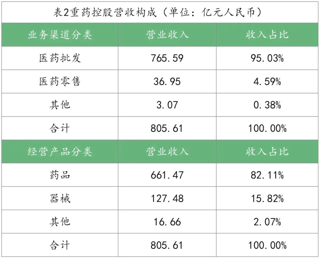 九州通医药在中国国内医药批发市场的占有率从2021年的6.49%提升至2023年的7.13%。在业绩亮点方面,总代品牌推广业务(CSO)2024年销售规模达192.67亿元;医药工业自产及OEM业务实现销售收入30.07亿元,同比增长21.49%;好药师B2C电商总代总销业务全年销售规模9.80亿元;此外,药九九B2B电商平台及零售电商服务平台业务年收入规模已达176.84亿元;数字物流与供应链解决方案业务实现营业收入10.64亿元,同比增长25.32%。重药控股公告中则是分别从业务渠道分类和按产品分类对营收构成进行了披露,具体情况如表2。其中,在药品部分重药控股还具体披露了中药和麻精的营收和占总营收的比重,分别为148.6亿元、18.45%和30.22、3.75%。从整体收入占比来看,“分销/批发业务”占据了核心位置,业务收入贡献占比均超73%。