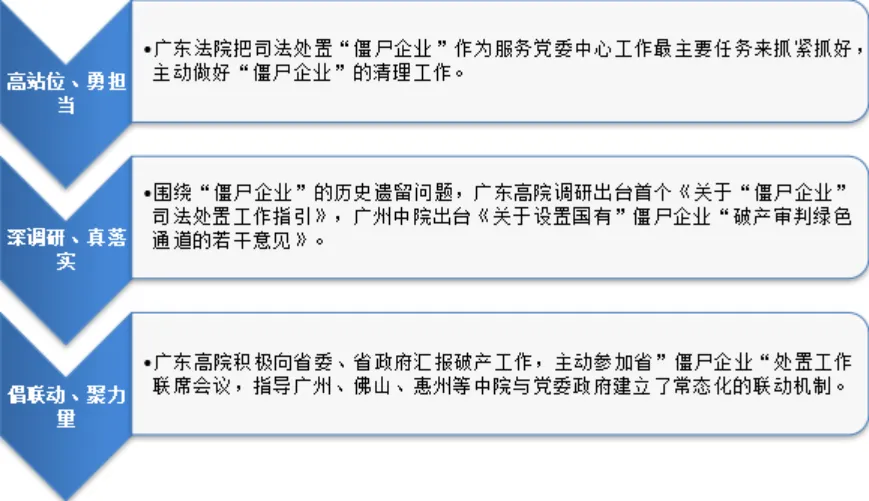 围绕“僵尸企业”多数为无财产、无场地、无账册的三无企业,申请破产主体欠缺、破产费用难以解决、人员安置、产权不清等历史遗留问题突出,广东高院调研出台全国首个《关于“僵尸企业”司法处置工作指引》,就“僵尸企业”破产和强制清算案件的受理、管辖、快速审理、适用执行措施等加以规范,快速立案、优先办理,按规定减免诉讼费用。广州中院出台《关于设置国有“僵尸企业”破产审判绿色通道的若干意见》,创设了“优先受理、优先审理、优先执行”以及“集中受理、集中选定管理人、集中审理、集中公告”的“三优先”、“四集中”审理模式,极大提高了僵尸企业破产审理效率。广东高院亲自参与“僵尸企业”破产清算工作,审结停止经营20多年的增城市医药总公司破产清算案,一揽子出清36户“僵尸企业”。