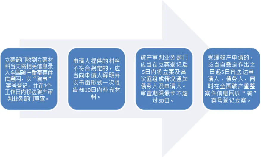 广东高院2017年5月下发《关于加强企业破产案件立案受理工作若干问题意见》,对提交材料、听证程序、各类程序转换等作出明确的时效要求。