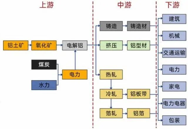 上游:先进行铝土矿开采,然后通过对铝土矿溶解、过滤、酸化和灼烧等工序提炼出氧化铝,然后通过电解熔融的方式制备电解铝。