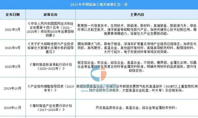 近年来,在中国铝加工行业受到各级政府的高度重视和国家产业政策的重点支持。国家出台陆续出台了多项政策,鼓励铝加工行业发展与创新,《增材制造标准领航行动计划(2020-2022年)》《关于扩大战略性新兴产业投资培育壮大新增长点增长极的指导意见》《新材料标准领航计划(2018-2020年)》等产业政策为铝加工行业的发展提供了明确、广阔的市场前景,为企业提供了良好的生产经营环境。