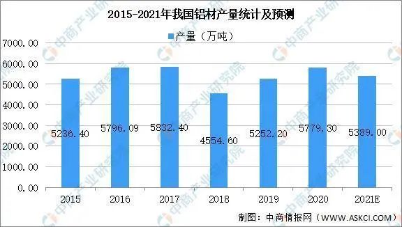 我国是铝加工大国。据统计,2015年至2020年,我国铝材产量从5236.4万吨增加到5779.3万吨,年均复合增长率为2%。预计2021年我国铝材产量将达5389万吨。