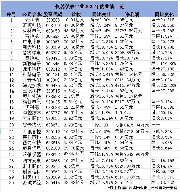 2025年,对于仪器仪表行业而言,是充满挑战与分化的一年。从已披露的30家上市企业年报数据来看,行业整体呈现“强者恒强、冰火两重天”的格局。一方面,受益于智能电网、新能源及国产替代的浪潮,部分企业实现了营收与净利润的双位数高增长;另一方面,受宏观经济波动、成本上升及市场竞争加剧的影响,也有不少企业陷入亏损或增速放缓的困境。
