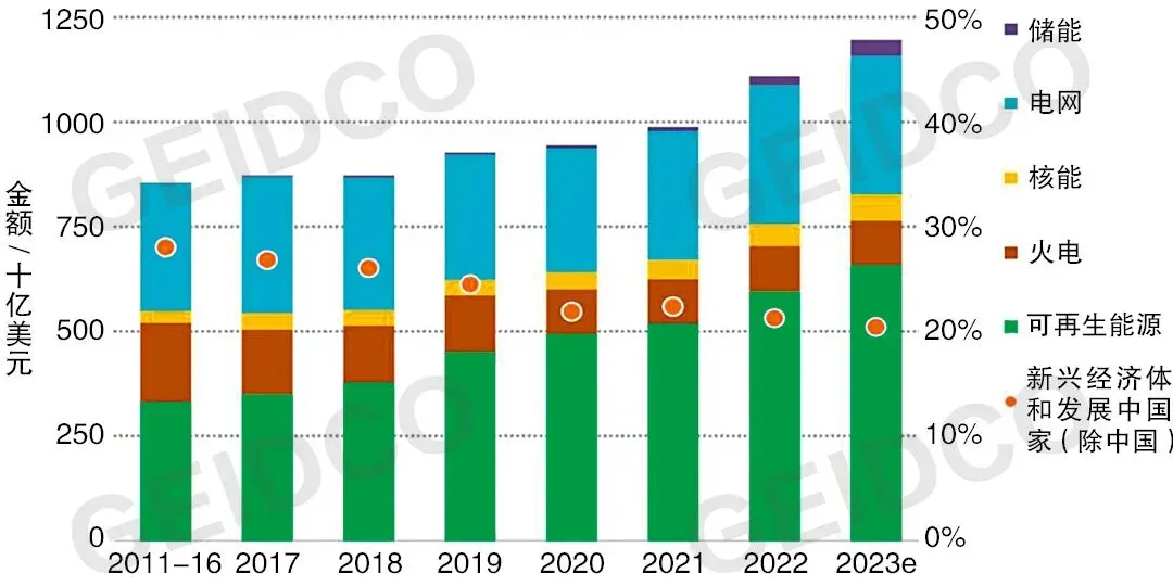 2023年全球电力行业投资有望达到1.2万亿美元,较2022年增长9%,主要投向可再生能源、电网、火电、核能和储能等领域。发达经济体和中国在可再生能源发电和电网投资领域处于领先地位,详见图2。