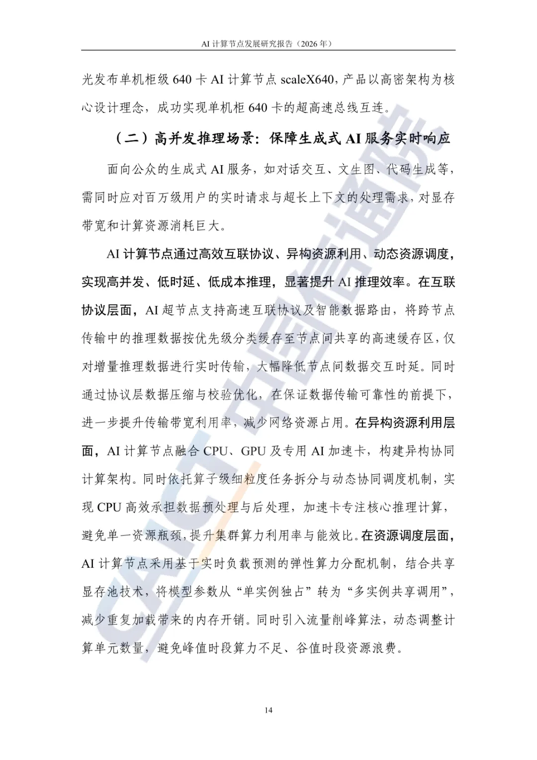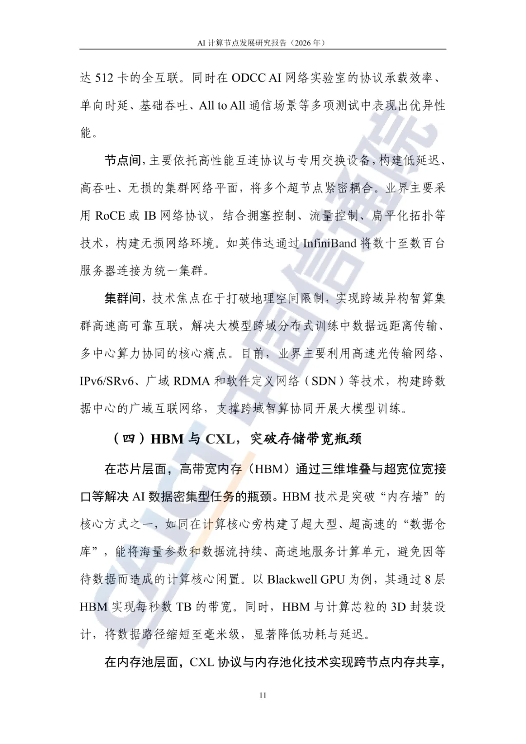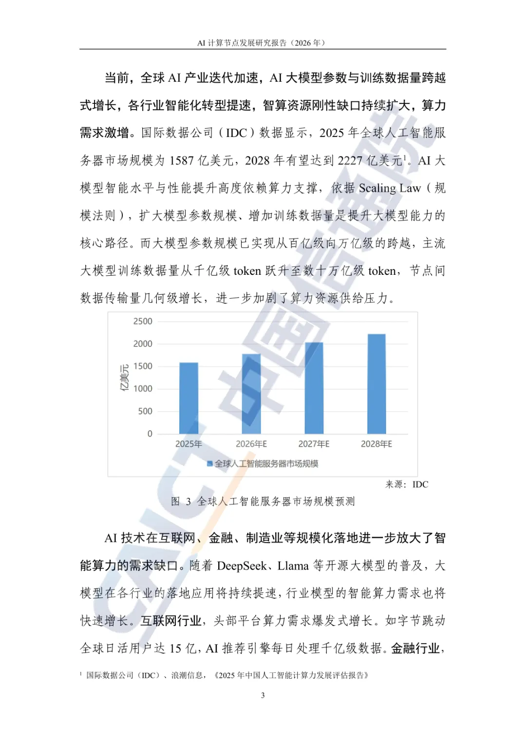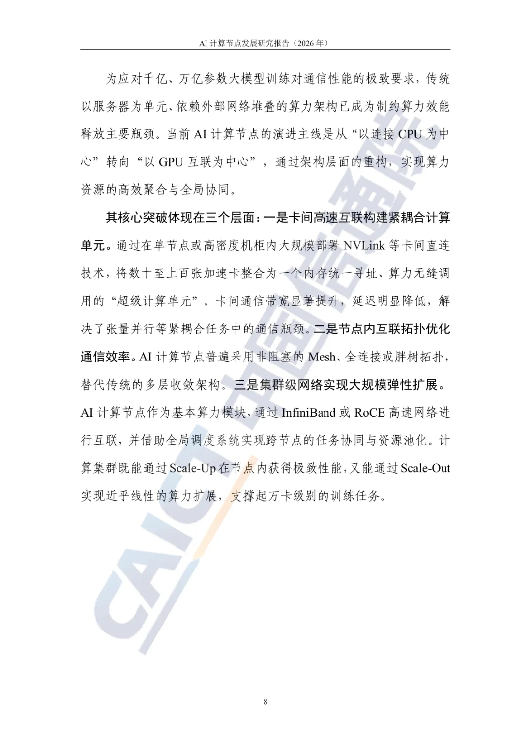 导读:AI 大模型参数规模与训练数据量爆发式增长,推动全球智算需求持续扩大,2025 年全球人工智能服务器市场规模达 1587 亿美元,AI 计算节点作为算力集群核心单元,成为破解算力瓶颈的关键。其以高密集约、高速超宽、高效灵活、高稳可靠为核心特征,通过架构重构与技术创新支撑智能算力高效输出。核心技术聚焦六大方向,节点架构从 “CPU 为中心” 转向 “GPU 互联为中心”,异构计算突破算力密度限制,超低时延网络破解数据传输瓶颈,HBM 与 CXL 技术缓解存储带宽压力,智能调度提升资源利用率,液冷等技术实现绿色低碳供能。应用场景覆盖大模型训练、高并发推理及行业智算,在金融风控、工业质检、能源调度等领域提供定制化算力支撑。产业生态呈现国际技术引领与国内自主创新并行格局,政策持续强化自主可控与协同发展导向。未来技术将向高效互联、高密集成演进,产业聚焦头部引领与生态协同,应用从试点向全域渗透,成为数字经济发展的核心算力底座。