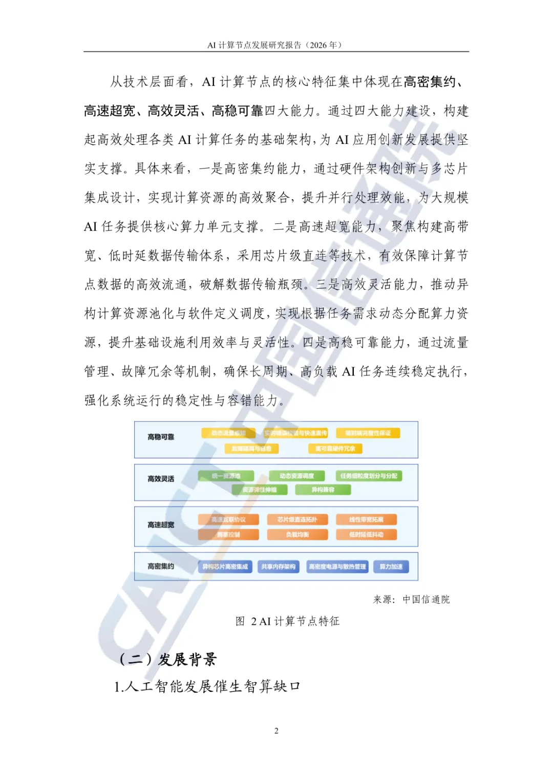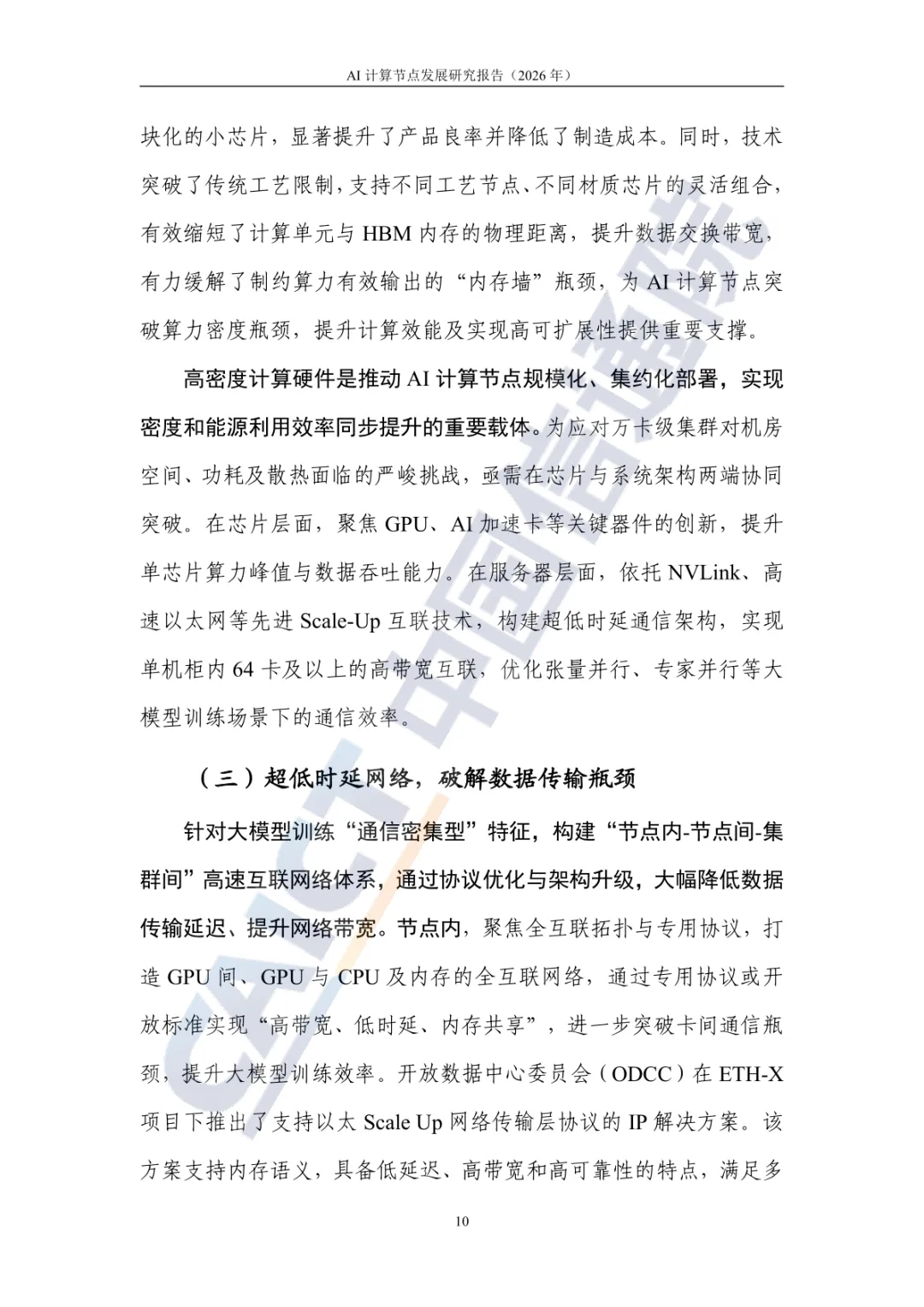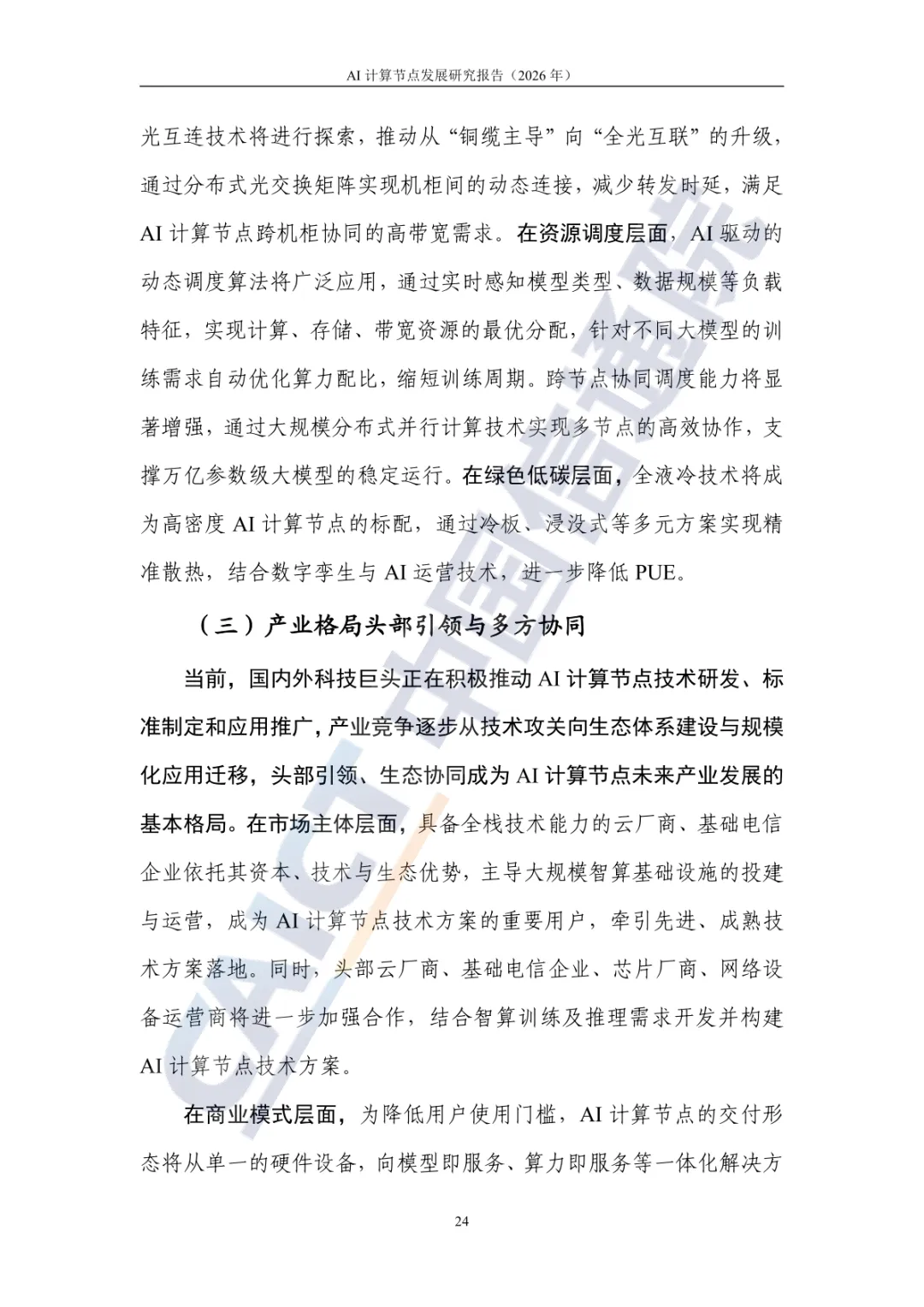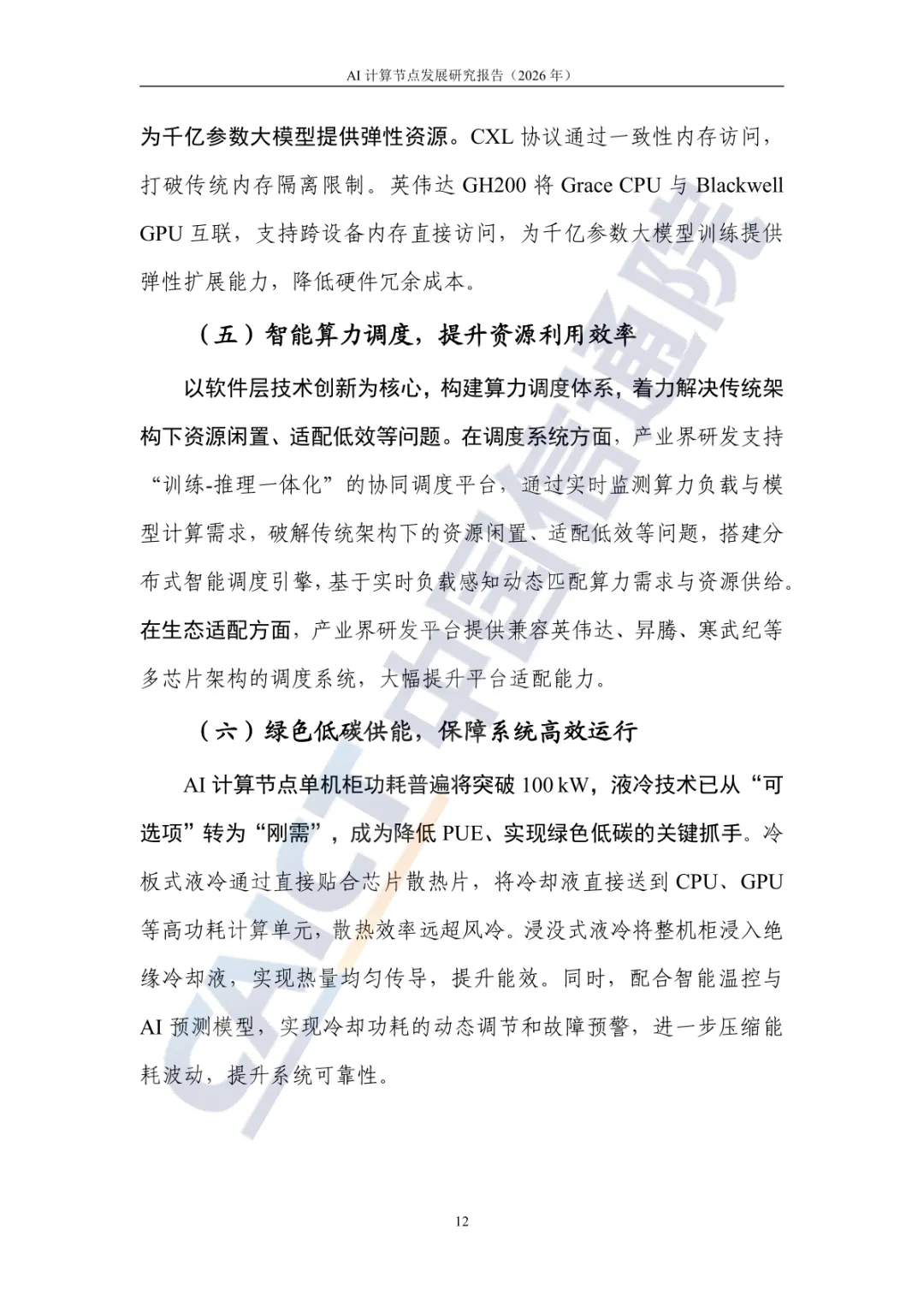 导读:AI 大模型参数规模与训练数据量爆发式增长,推动全球智算需求持续扩大,2025 年全球人工智能服务器市场规模达 1587 亿美元,AI 计算节点作为算力集群核心单元,成为破解算力瓶颈的关键。其以高密集约、高速超宽、高效灵活、高稳可靠为核心特征,通过架构重构与技术创新支撑智能算力高效输出。核心技术聚焦六大方向,节点架构从 “CPU 为中心” 转向 “GPU 互联为中心”,异构计算突破算力密度限制,超低时延网络破解数据传输瓶颈,HBM 与 CXL 技术缓解存储带宽压力,智能调度提升资源利用率,液冷等技术实现绿色低碳供能。应用场景覆盖大模型训练、高并发推理及行业智算,在金融风控、工业质检、能源调度等领域提供定制化算力支撑。产业生态呈现国际技术引领与国内自主创新并行格局,政策持续强化自主可控与协同发展导向。未来技术将向高效互联、高密集成演进,产业聚焦头部引领与生态协同,应用从试点向全域渗透,成为数字经济发展的核心算力底座。
