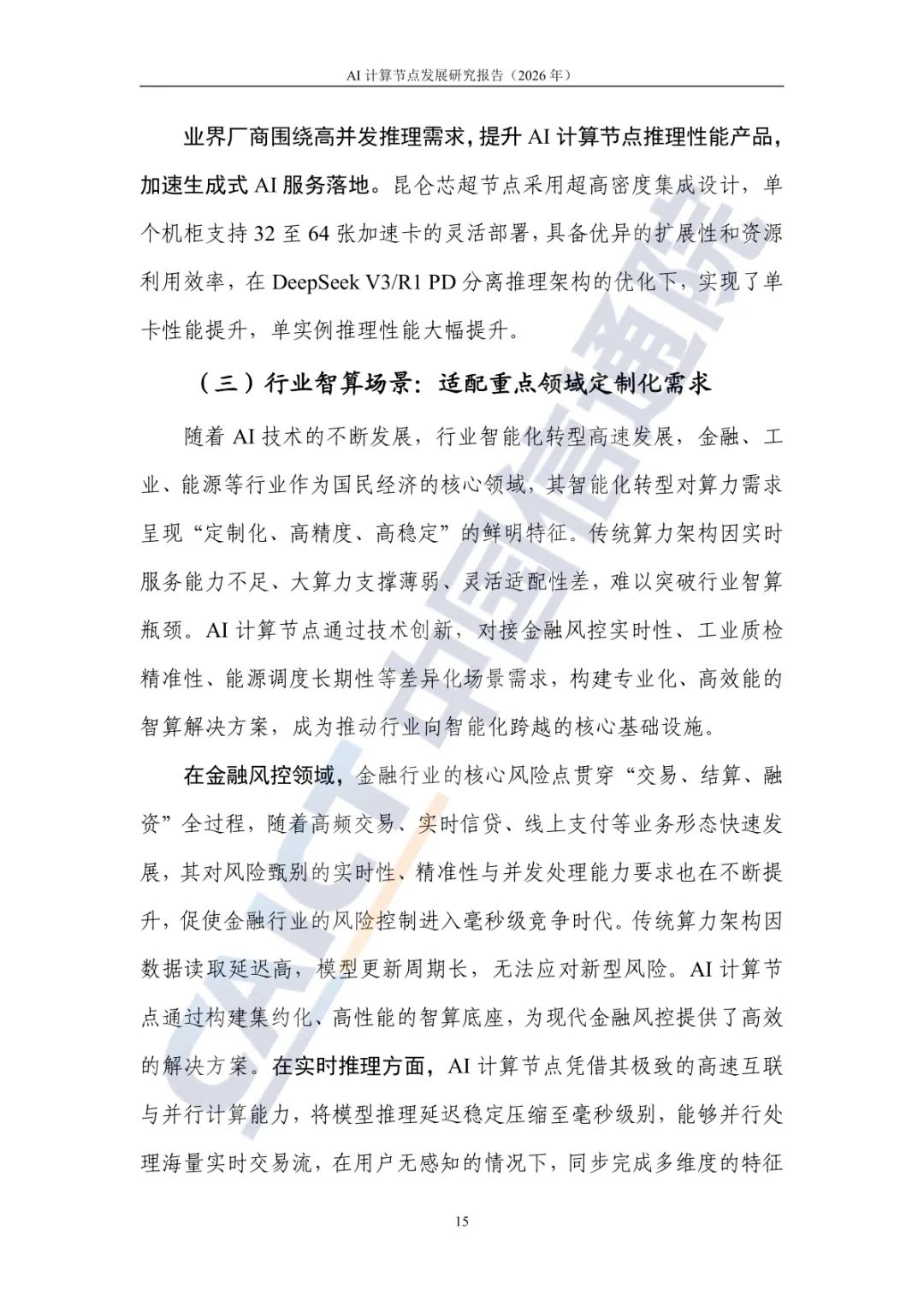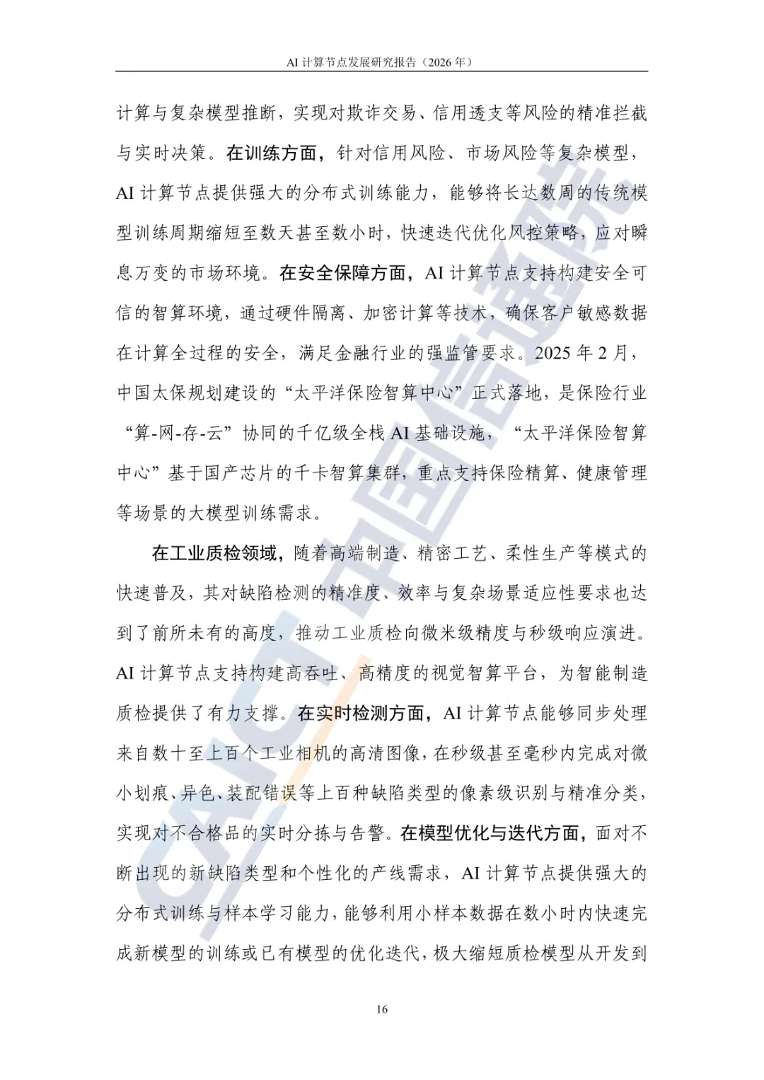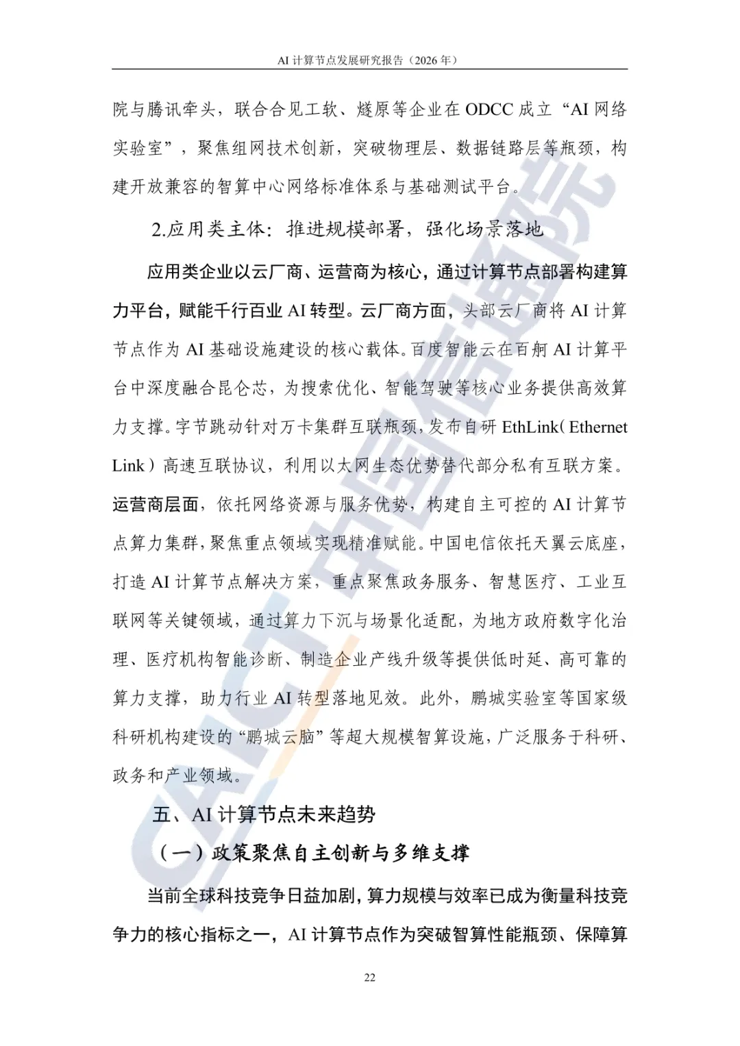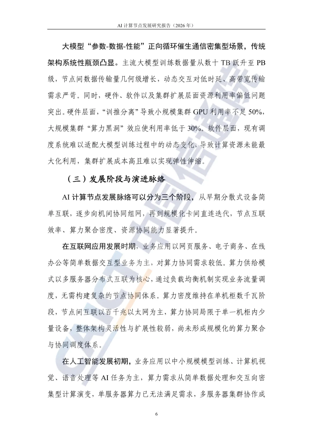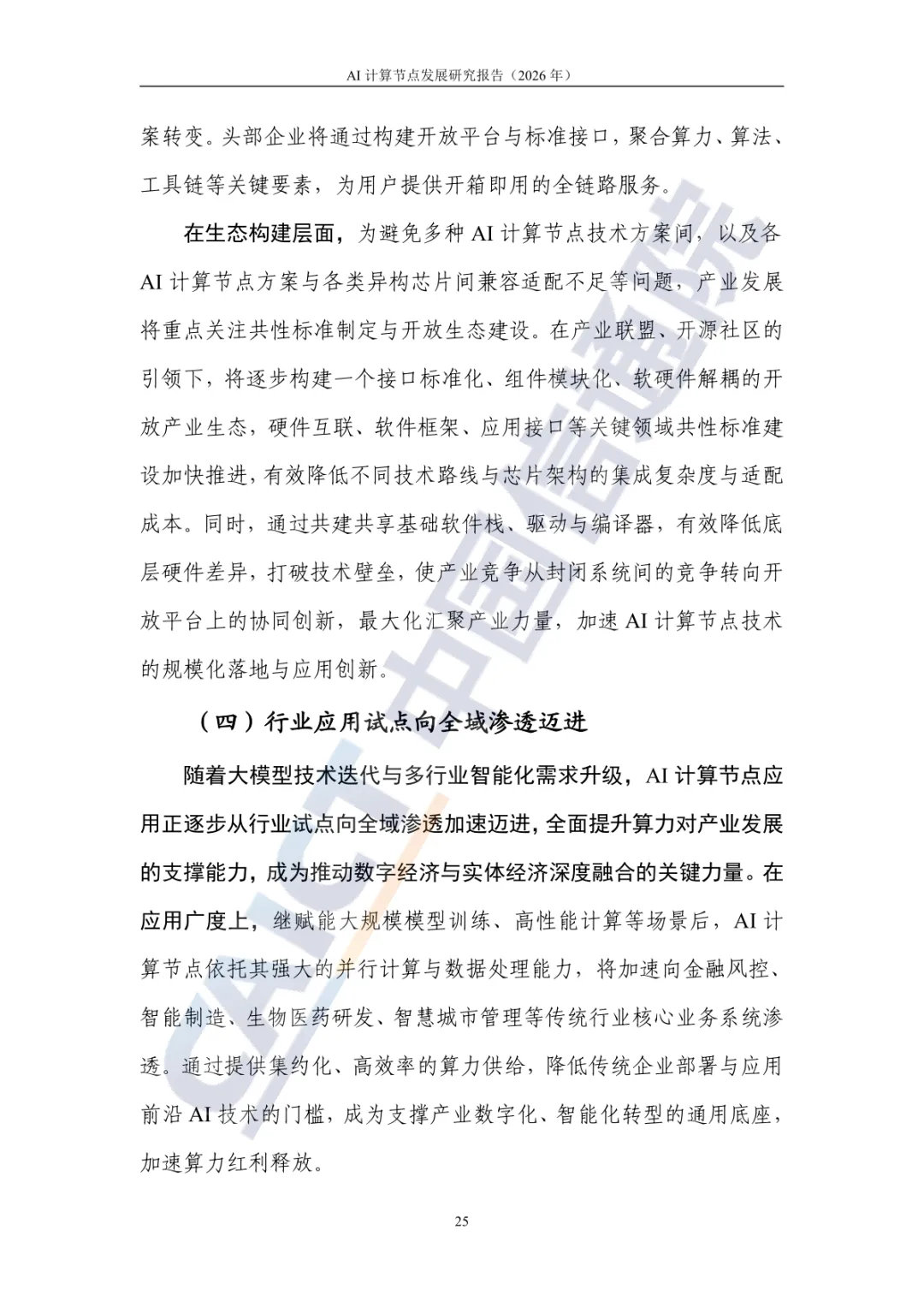 导读:AI 大模型参数规模与训练数据量爆发式增长,推动全球智算需求持续扩大,2025 年全球人工智能服务器市场规模达 1587 亿美元,AI 计算节点作为算力集群核心单元,成为破解算力瓶颈的关键。其以高密集约、高速超宽、高效灵活、高稳可靠为核心特征,通过架构重构与技术创新支撑智能算力高效输出。核心技术聚焦六大方向,节点架构从 “CPU 为中心” 转向 “GPU 互联为中心”,异构计算突破算力密度限制,超低时延网络破解数据传输瓶颈,HBM 与 CXL 技术缓解存储带宽压力,智能调度提升资源利用率,液冷等技术实现绿色低碳供能。应用场景覆盖大模型训练、高并发推理及行业智算,在金融风控、工业质检、能源调度等领域提供定制化算力支撑。产业生态呈现国际技术引领与国内自主创新并行格局,政策持续强化自主可控与协同发展导向。未来技术将向高效互联、高密集成演进,产业聚焦头部引领与生态协同,应用从试点向全域渗透,成为数字经济发展的核心算力底座。